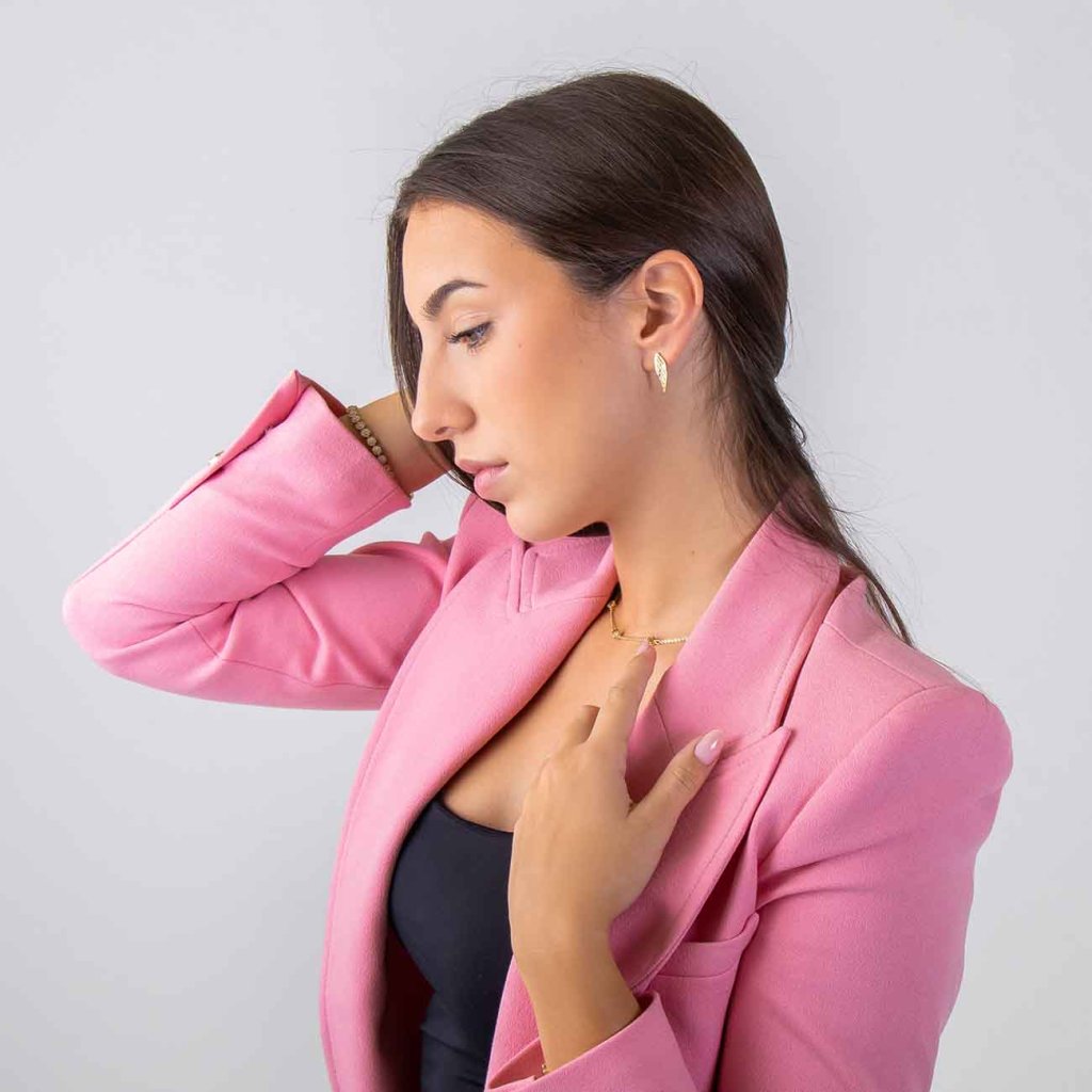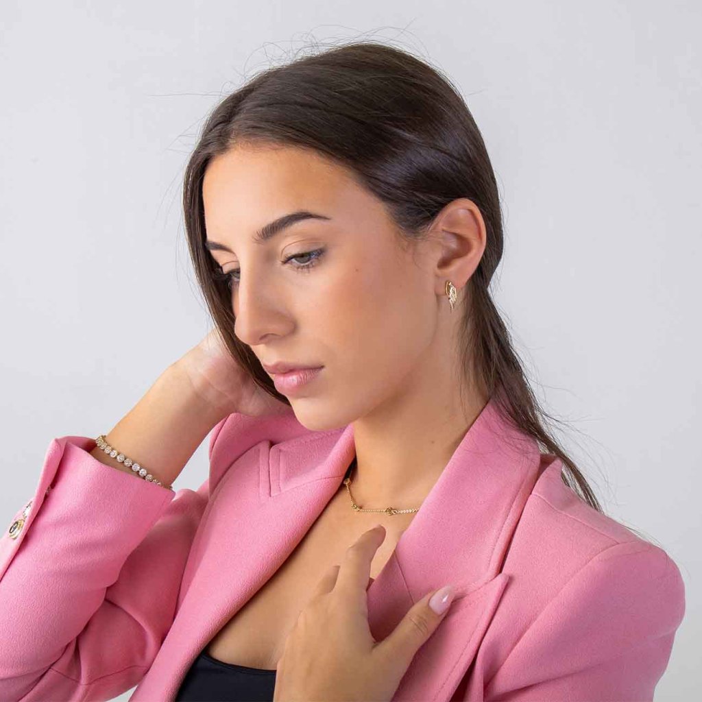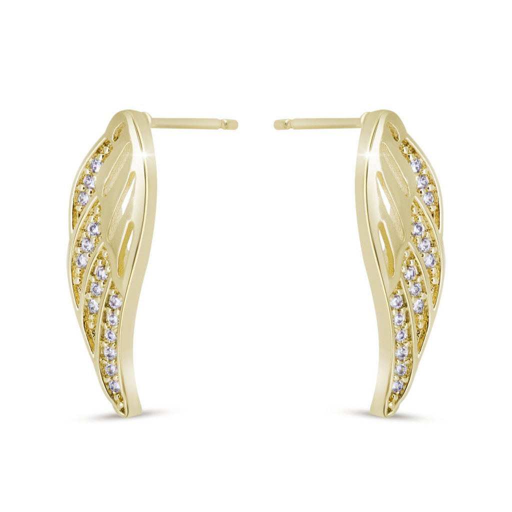 Az angyalszárnyak könnyedsége által ihletett elegáns fülbevalók finomak, mégis kifejezőek. A fényes, aranyos kivitel csillogó cirkóniákkal van díszítve, amelyek minden mozdulatnál szikrát adnak az ékszernek. Formájuknak köszönhetően optikailag meghosszabbítják a fül vonalát, és nagyon kifinomult hatást keltenek. Ideális ünnepi és mindennapi viseletre egyaránt.