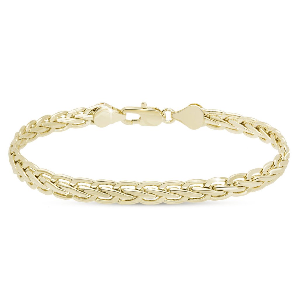 A finoman szőtt mintázatú, ízléses karkötő ideális választás a mindennapi eleganciához. A fényes felület és a visszafogott forma időtálló kiegészítővé teszi, amely könnyen kombinálható más ékszerekkel. A 14 karátos aranyozás kiemeli a luxus megjelenését.