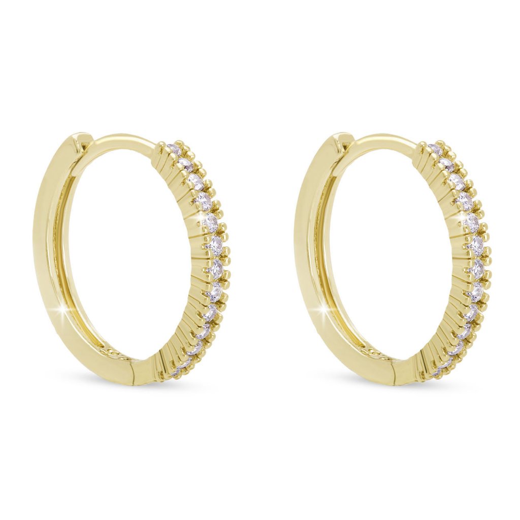 A luxus hatású, arany színű fülbevalót számos apró, tiszta cirkónia díszíti, amelyek gyönyörűen fogják fel a fényt, és finom csillogást kölcsönöznek a fülbevalóknak. A karika klasszikus formája az elegáns részletekkel kombinálva ideális kiegészítővé teszi a mindennapi és ünnepi alkalmakra egyaránt.
