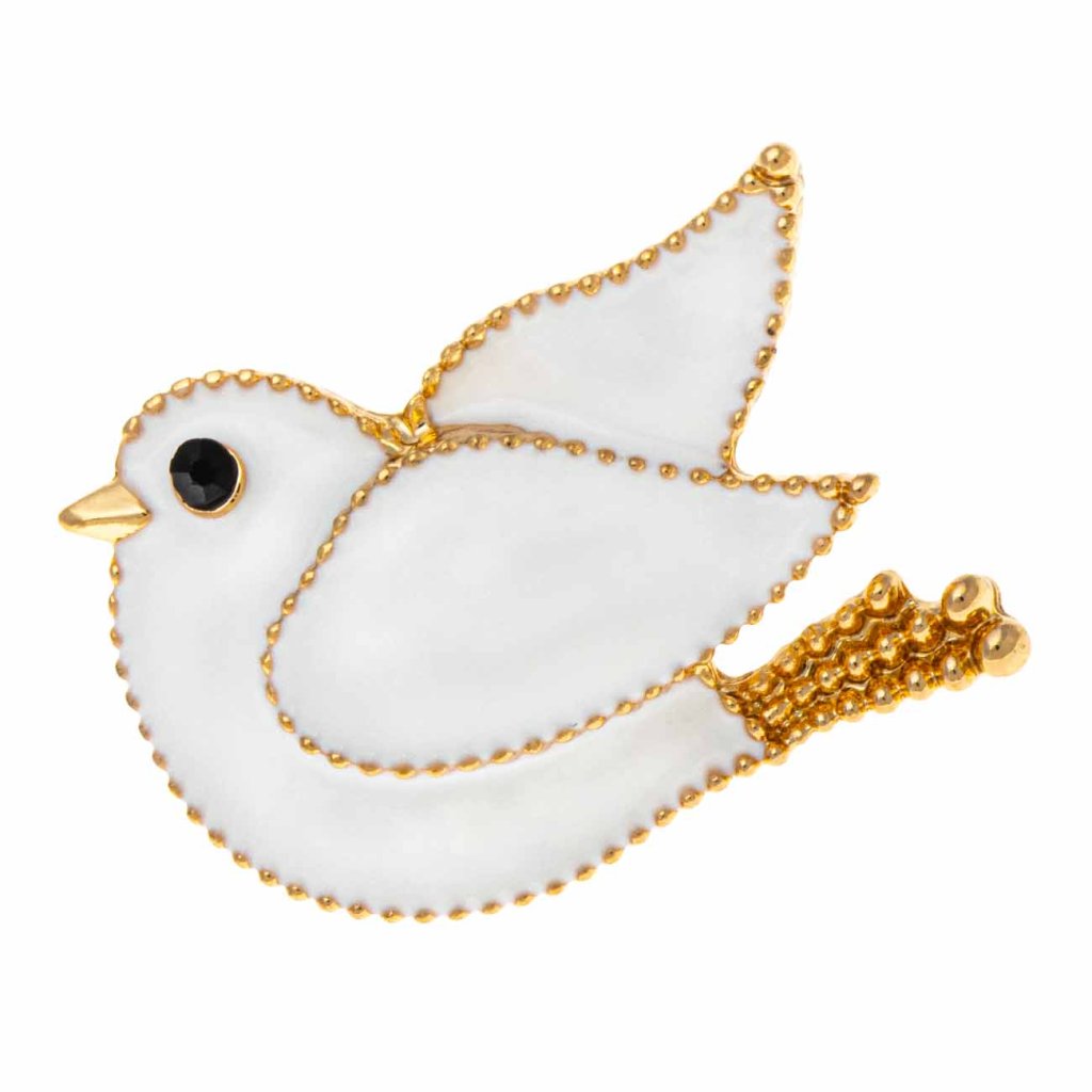 Ez a finom, repülő galamb alakú bross a béke, a szeretet és a szabadság szimbóluma. A testet és a szárnyakat fehér zománc és finom arany szegély díszíti, amely luxus megjelenést kölcsönöz az ékszernek. A fekete kavicsból készült szem hangsúlyos részletet képez, és egyedi jelleget kölcsönöz a brossnak. Finomságának és szimbolikájának köszönhetően ideális kiegészítő ünnepi és mindennapi viselethez – zakóhoz, ruhához vagy kabáthoz.