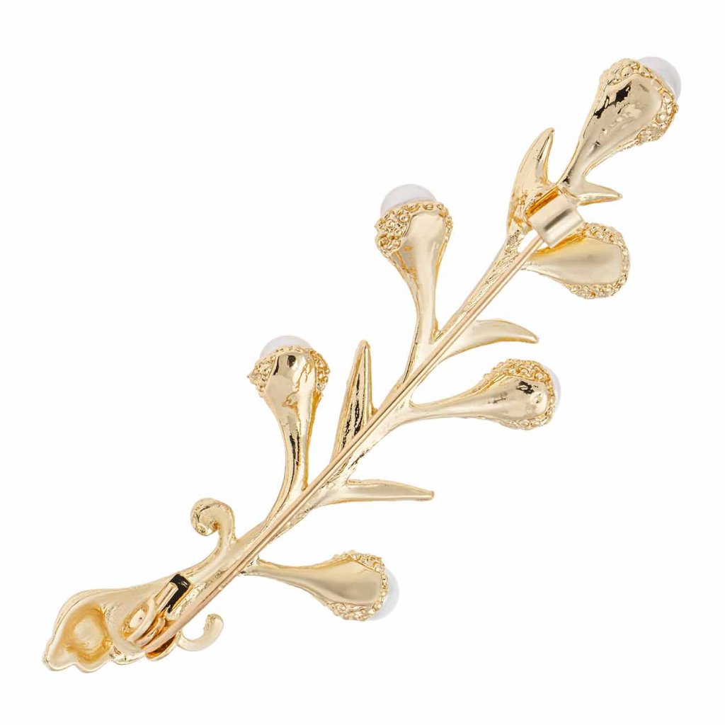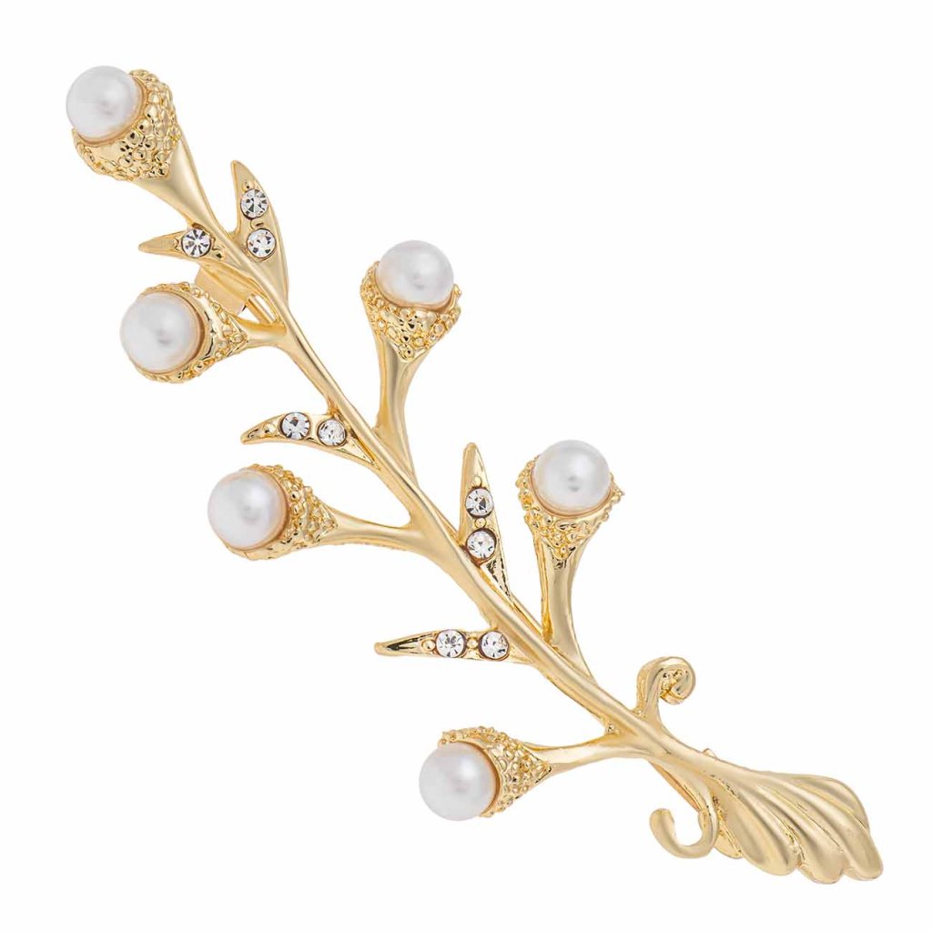 Ez az időtlen, finom ág formájú bross hat gyönggyel és apró, tiszta cirkóniával van díszítve, amelyek finom fényt kölcsönöznek neki. Kabát, ruha vagy sál díszeként is kiválóan alkalmas, a klasszikus bross tűs rögzítésnek köszönhetően könnyen rögzíthető. Arany és ezüst kivitelben is kapható.