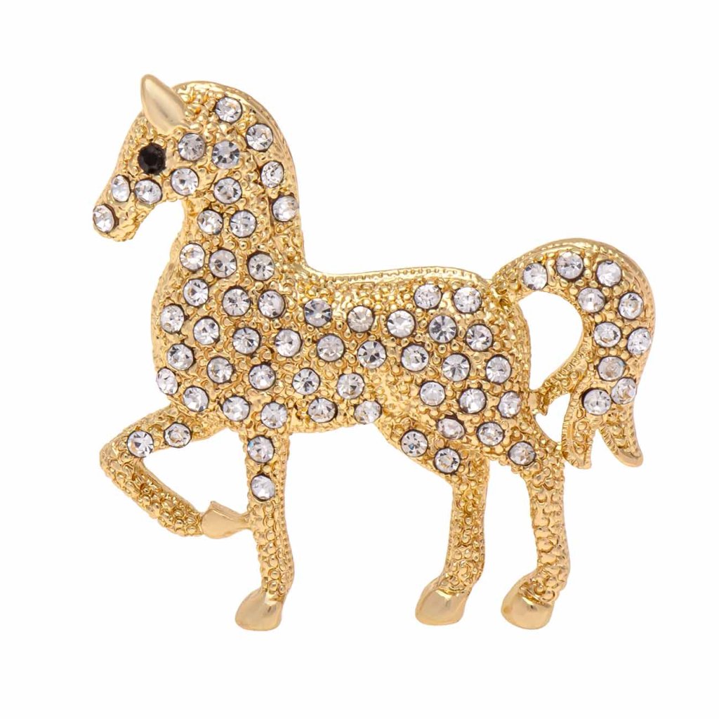 A feltűnő, ló alakú bross dinamikus megjelenésével és a tiszta cirkónia kövekkel való gazdag díszítésével hívja fel magára a figyelmet. A bizsu fémből készült elegáns arany felület kiemeli a sörény, a farok és a sziluett részleteit. Az erő, a szabadság és a szépség szimbóluma egy bross formájában, amely feldobja a zakót, a sálat vagy a kézitáskát. A rögzítés klasszikus bross tűvel van megoldva.