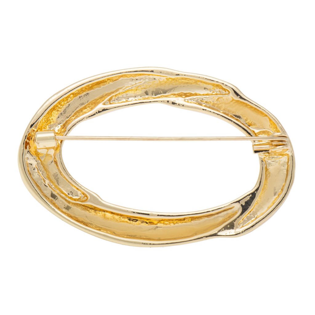 Az elegáns, szabálytalan ovális formájú, fényes arany színű bross modern és időtálló hatást kelt. Ideális választás a letisztult design kedvelőinek, akik nem vágynak felesleges díszítésekre. Remekül illik kabáthoz, blúzhoz vagy sálhoz, mint finom, de hangsúlyos részlet. Bizsu fémből készült, a rögzítése klasszikus bross tűvel történik.