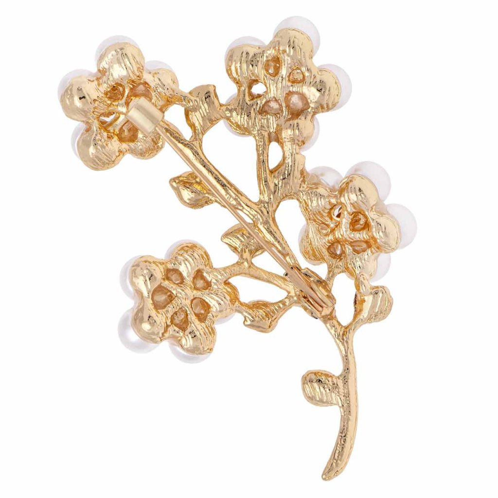 A finom, virágzó ág formájú, fényes arany színű bross feldobja bármelyik öltözéket. A virágokat gyöngyök és finoman csiszolt cirkónia alkotják, amelyek romantikus csillogást kölcsönöznek az ékszernek. Ideális kiegészítő zakóhoz, kabáthoz vagy ünnepi ruhához. Bizsu fémből készült, a rögzítése bross tűvel történik.