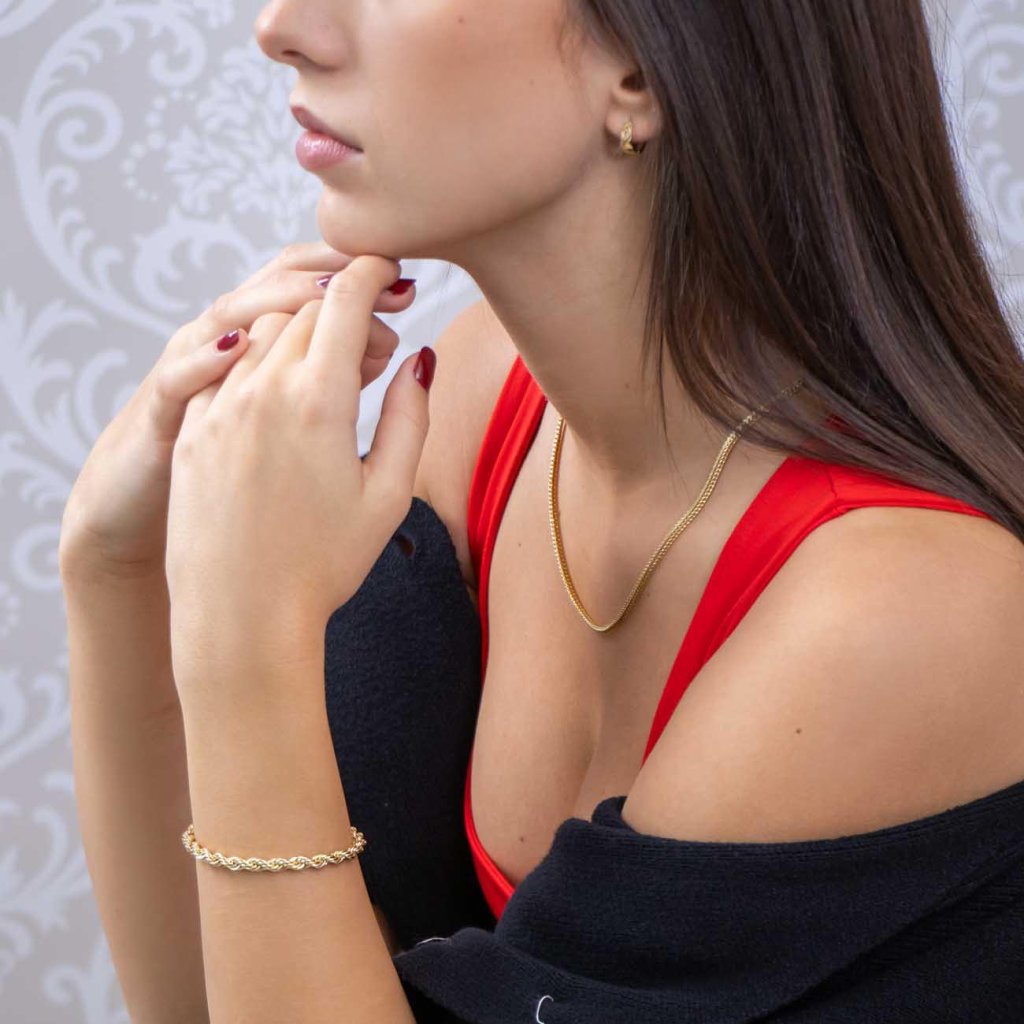 A feltűnő, elegáns, csavart mintázatú, kötélre emlékeztető karkötő plasztikus formájával és tökéletesen polírozott felületével nyűgöz le. Szoliterként és más ékszerekkel kombinálva is remekül mutat a modern rétegezéshez.