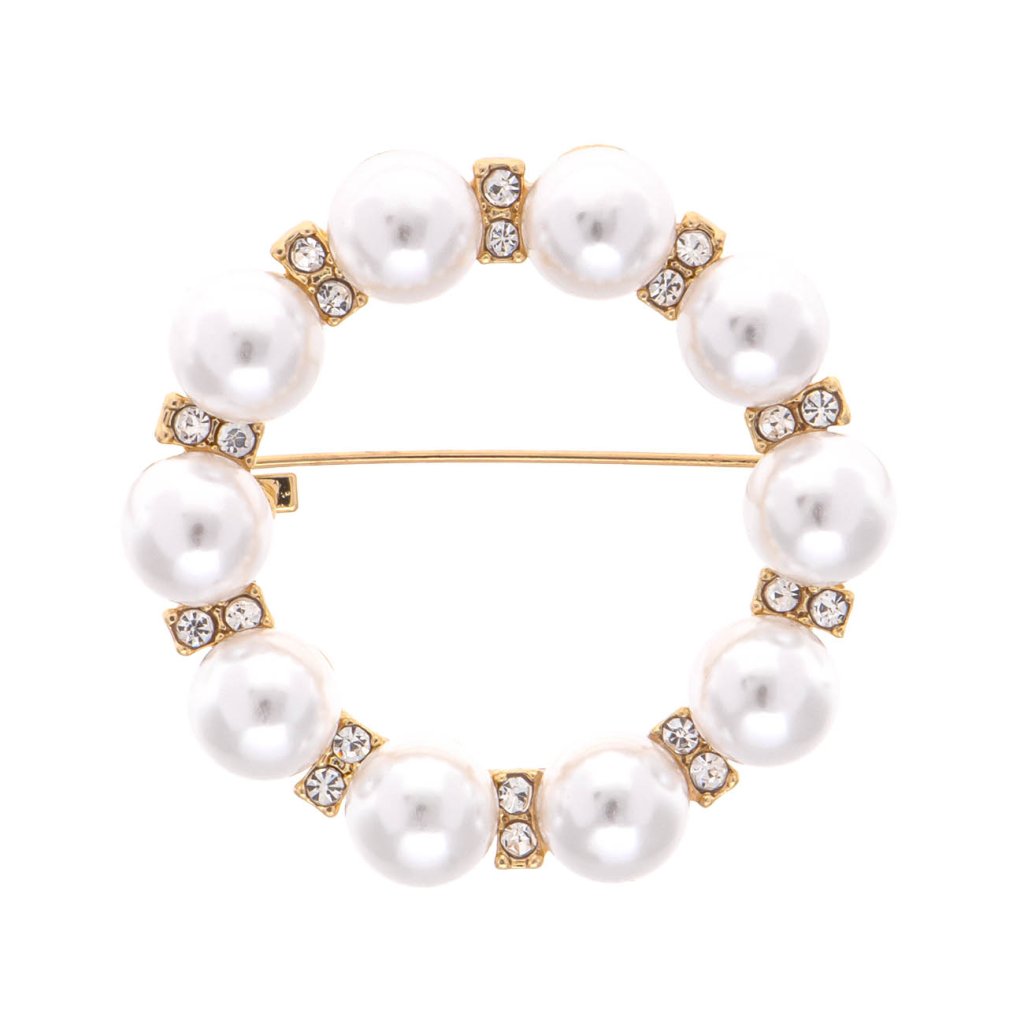Ez a klasszikus, meleg arany bevonatú, kör alakú bross időtlen megjelenésével és a gyöngyök, valamint az átlátszó cirkóniák gondosan kiegyensúlyozott kombinációjával fog lenyűgözni. Alkalmas feltűnő esküvői kiegészítőként, de elegáns mindennapi viseletnek is.