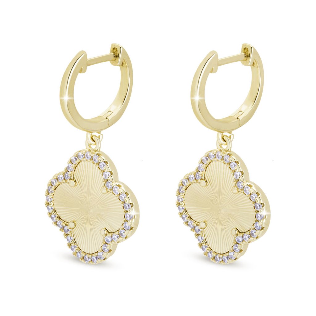 Négylevelű lóherék, amelyek szerencsét és stílust hoznak. A négylevelű lóhere alakú lógó fülbevalókat finom gravírozás és apró, tiszta cirkónia kövek szegélyezése emeli ki, amelyek finom csillogást kölcsönöznek az ékszernek. A praktikus kapcsos zárásnak köszönhetően jól tartanak és kényelmes viseletet biztosítanak. Tökéletes kiegészítő ünnepi alkalmakra és a mindennapi öltözék finom kiemelésére.
