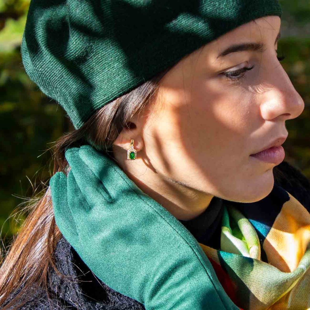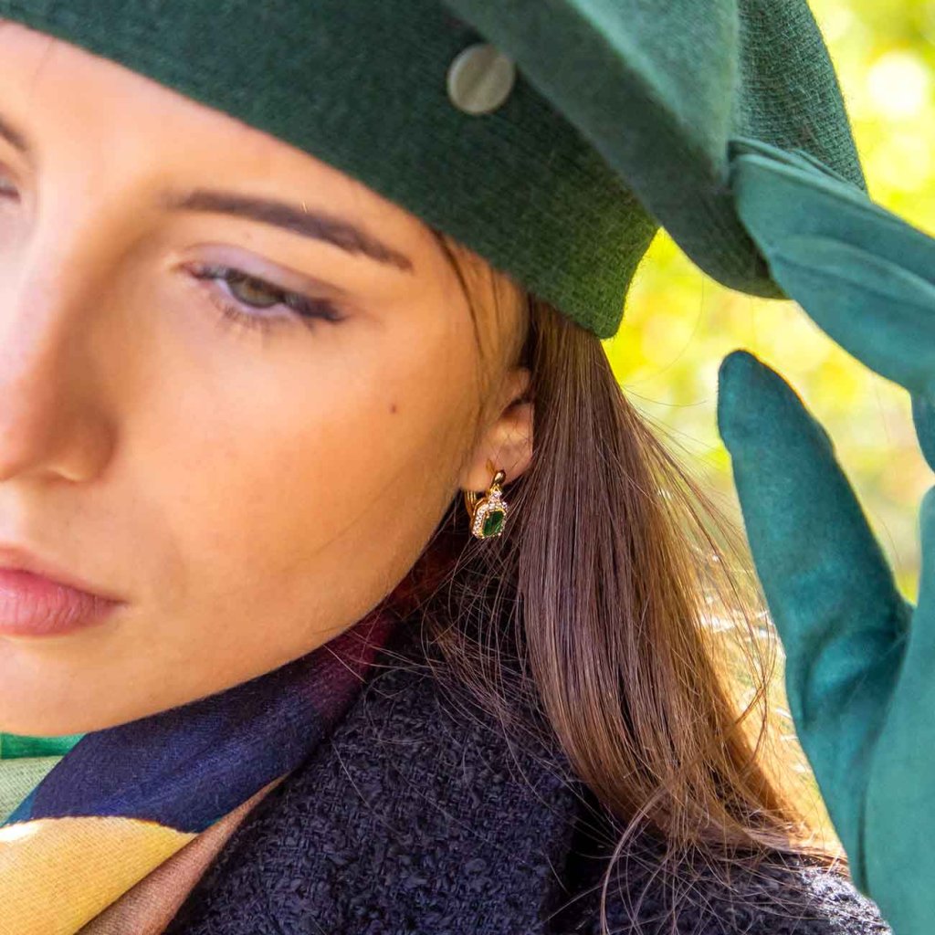 Aranyozott fülbevaló 14 k arany, téglalap alakú, nagy zöld cirkóniával és a kerületükön elhelyezett apró cirkóniákkal.