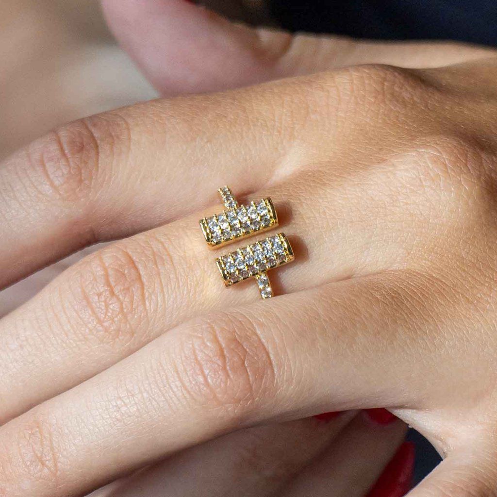 Elegáns, nyitott kialakítású, cirkóniákkal gazdagon díszített gyűrű friss és modern megjelenést kölcsönöz. Az aprólékosan beillesztett cirkóniák ragyogó fényt kölcsönöznek az ékszernek, míg a minimalista vonalvezetés finom és ízléses hatást kelt. Ideális kiegészítő azok számára, akik eredeti, mégis időtlen ékszert keresnek.