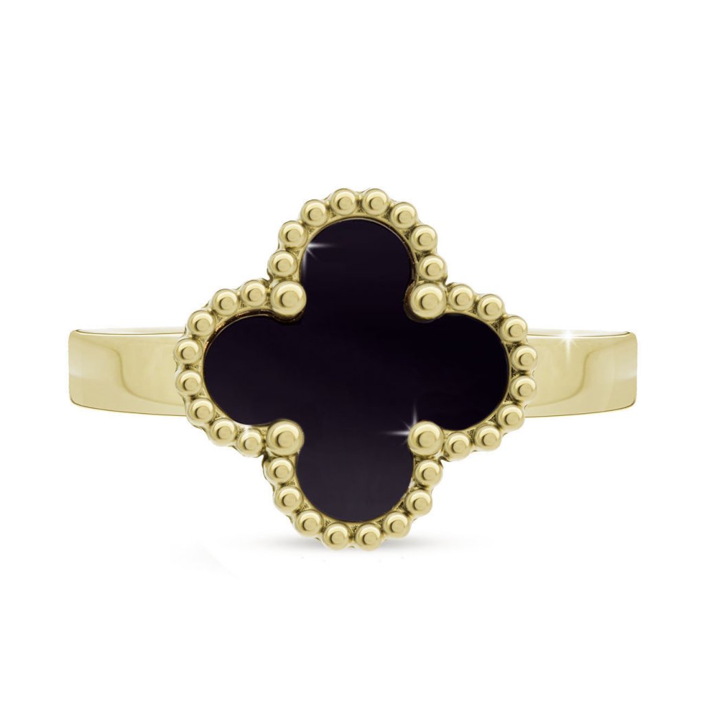 Stílusos gyűrű első osztályú sebészeti acélból, 14 karátos arannyal nemesítve, melyet a fekete négylevelű lóhere hangsúlyos dizájnja emel ki. A sötét, fényes közép elegánsan és kifinomultan hat, míg a finom recézés a kerületén luxus érzetet kölcsönöz az ékszernek.