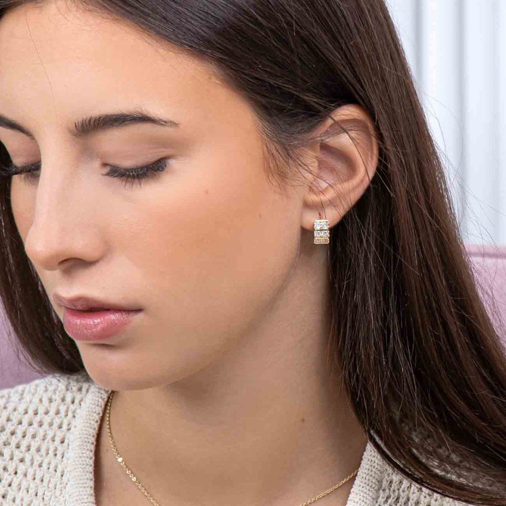 Elegáns, klasszikus, kör alakú fülbevaló, amelyet három sor tiszta cirkónia díszít, ami luxusfényt kölcsönöz neki. Az oldalsó nyílások könnyedséget és légies megjelenést kölcsönöznek a dizájnnak. A fényes, aranyozott felületnek köszönhetően a fülbevaló ünnepélyes és stílusos – ideális választás partira és kifinomult kiegészítőként a munkához.