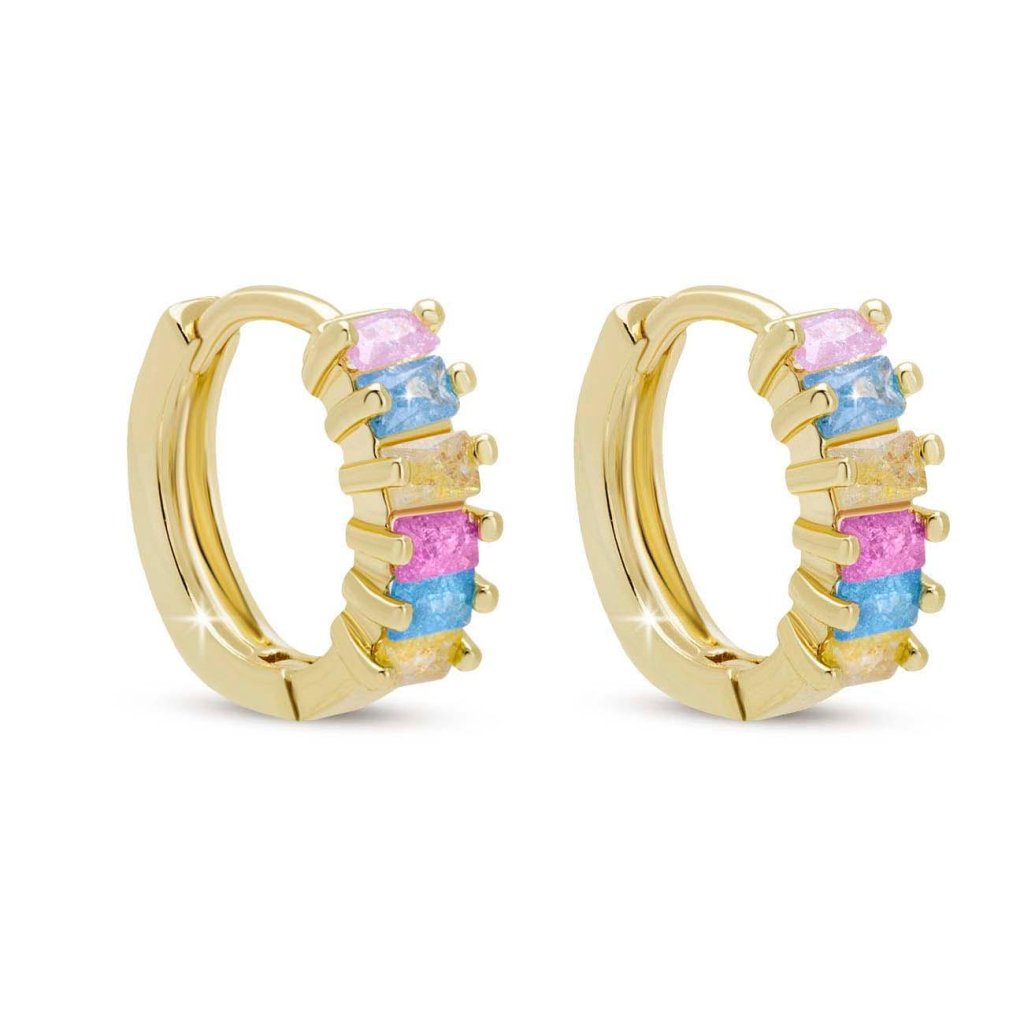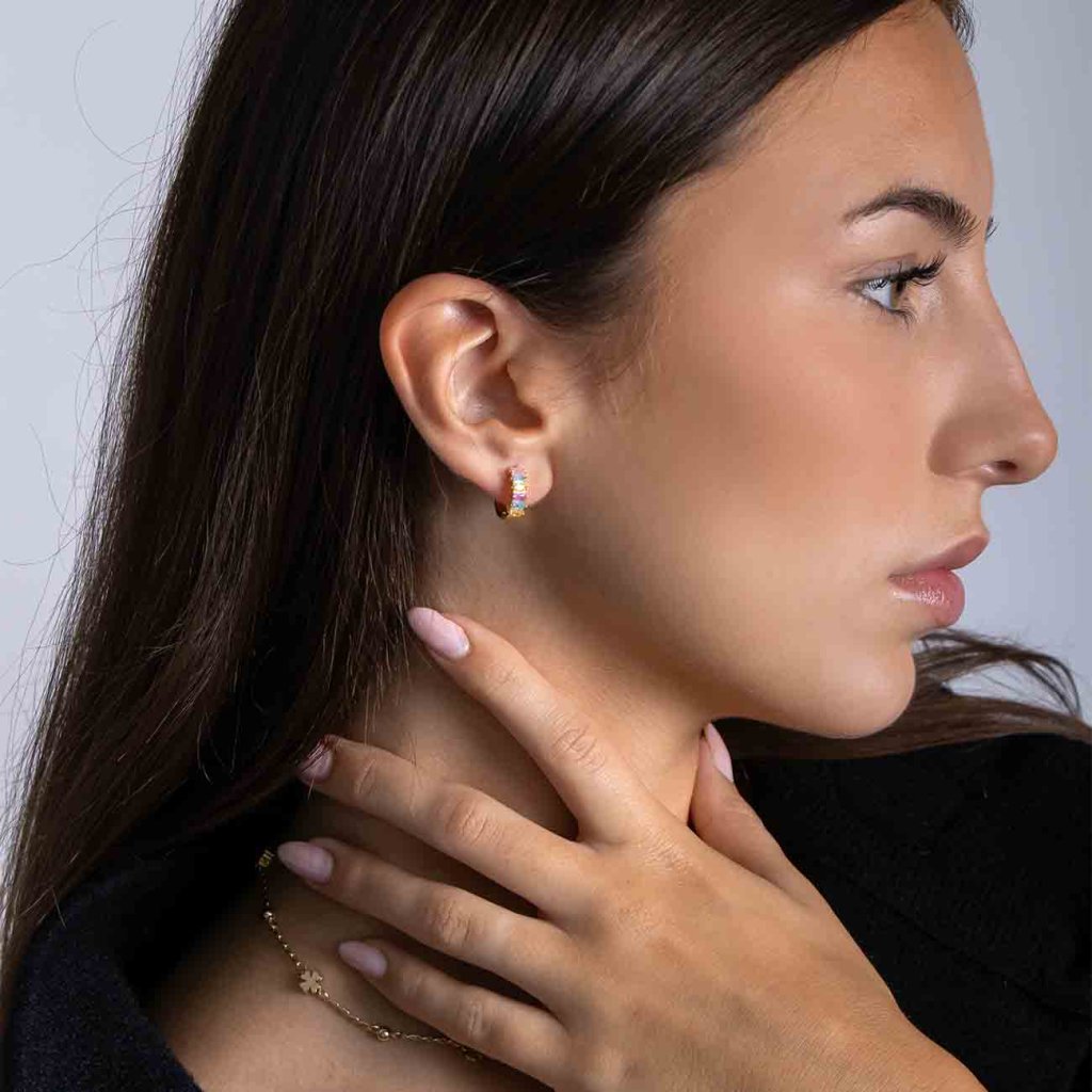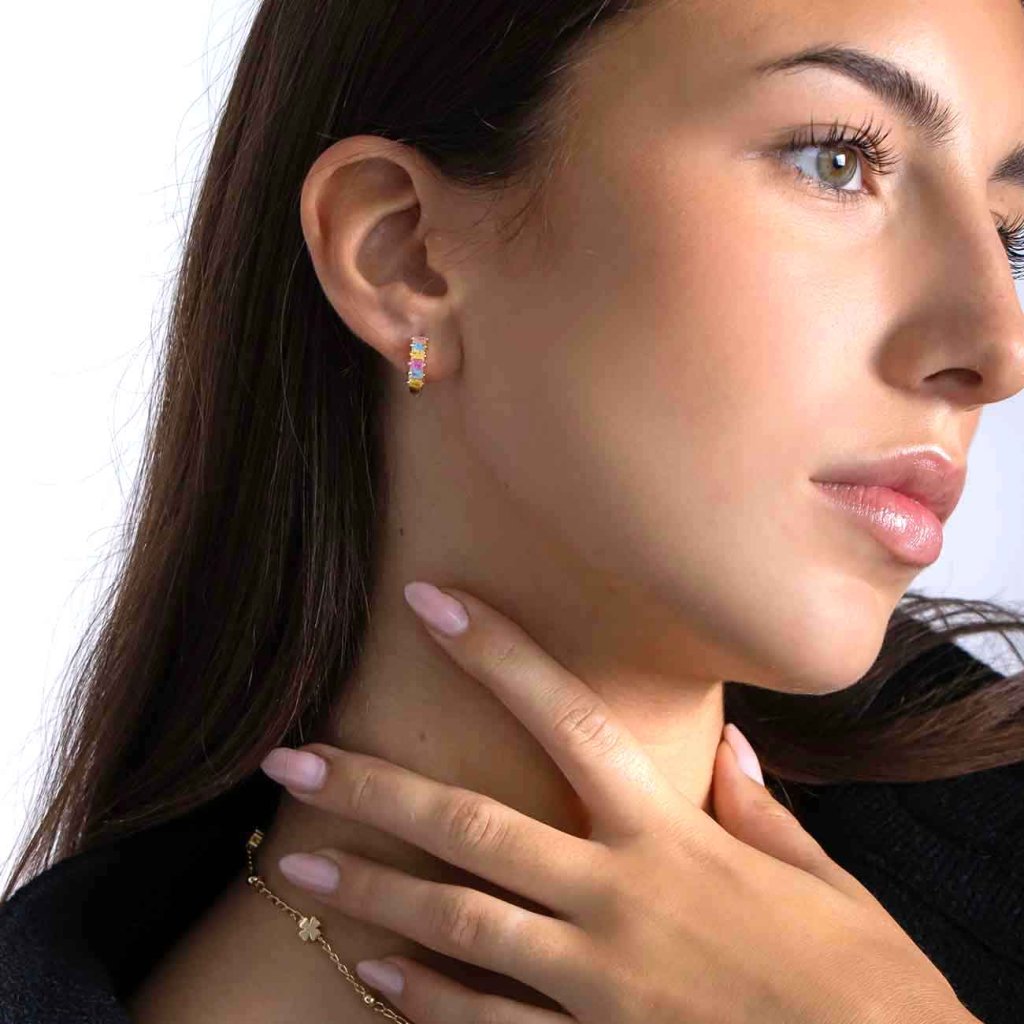 A finoman csiszolt cirkónia kövekkel díszített, pasztell rózsaszín, kék, sárga és lila árnyalatú karika fülbevalók játékos eleganciát kölcsönöznek a modern értelmezésben. A fényes aranyozás meleg luxusérzetet kölcsönöz az ékszernek, míg a pasztell kövek minden mozdulattal ragyognak. Univerzális kialakításuknak köszönhetően könnyen kombinálhatók a hétköznapi és az ünnepi öltözetekkel is.