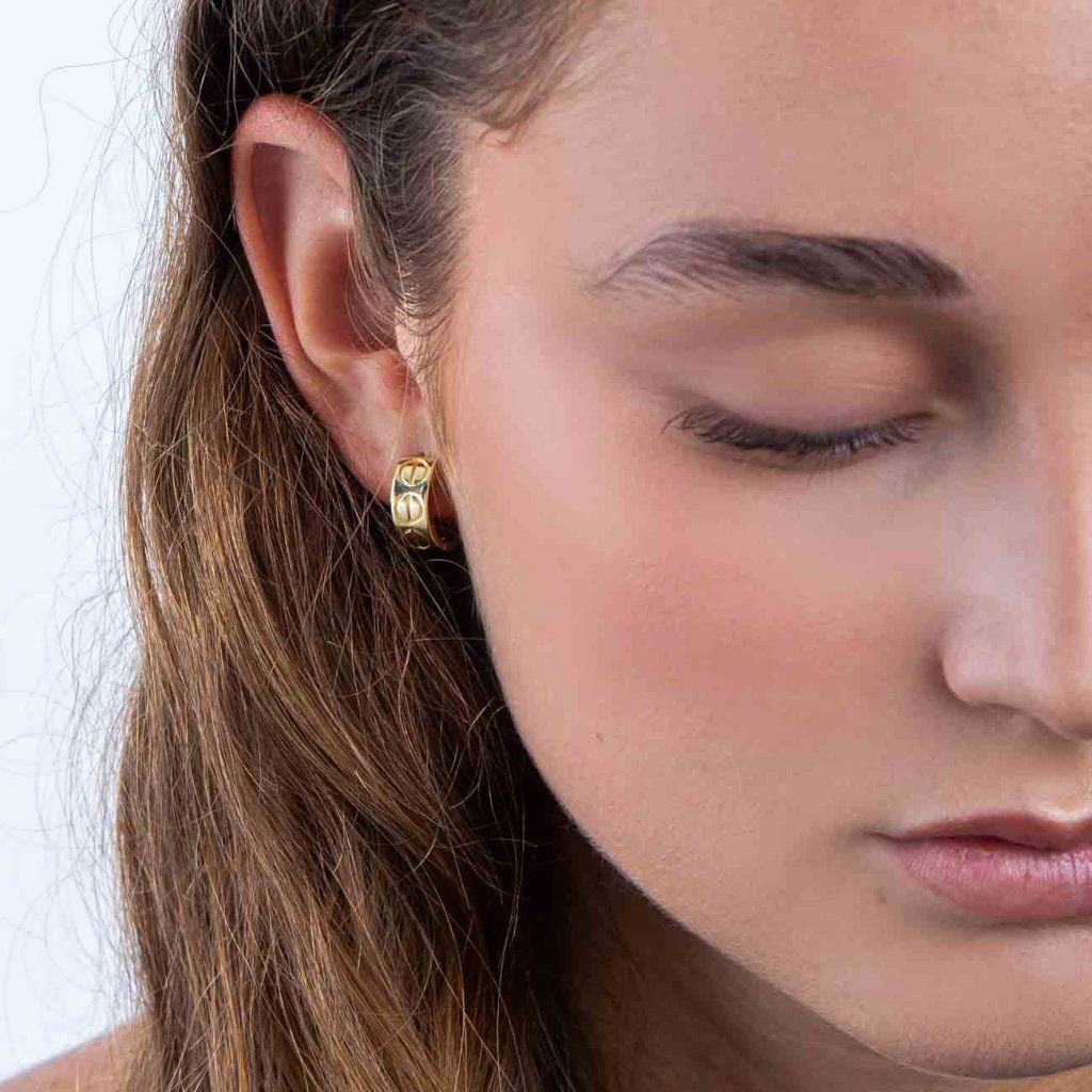 Minimalista és modern fülbevalók kisebb karika formában, amelyek sima, fényes felületükkel és ovális vonalak formájában vésett dekorációjukkal hívják fel magukra a figyelmet. Ez a részlet az ikonikus csavarminta stílusát idézi, és eredeti dizájnt kölcsönöz az ékszernek felesleges díszítés nélkül.