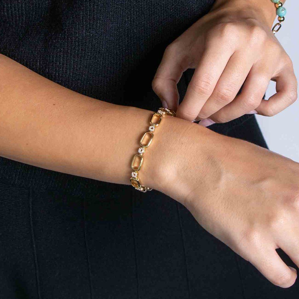 A modern, eredeti dizájnú karkötő a fényes, téglalap alakú szemeket finoman csillogó cirkónium kövekkel ötvözi. Geometrikus kialakításának és a luxus aranyozásnak köszönhetően egyszerre elegáns és játékos. Ideális kiegészítő formális és lezser stílushoz egyaránt.