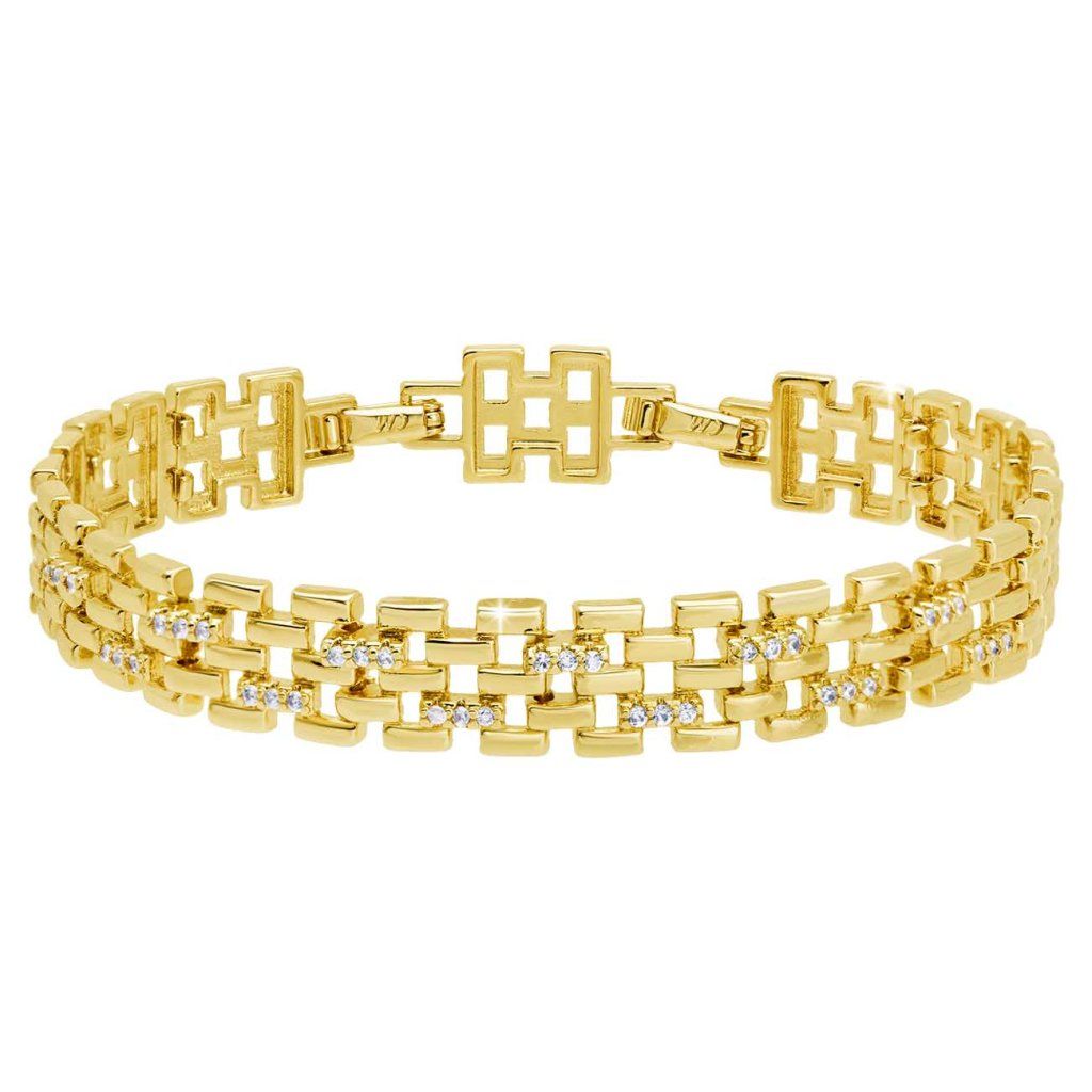 A sebészeti acélból készült, luxus szemláncos karkötő szabályos, dupla szerkezetével és a tiszta cirkónia kövekkel való gazdag díszítésével hívja fel magára a figyelmet. A precíz kidolgozásnak és a szilárd, téglalap alakú szemeknek köszönhetően elegáns és egyben tartós hatást kelt. A felület 14 karátos arannyal van bevonva, ami luxus megjelenést és hosszú élettartamot kölcsönöz az ékszernek.