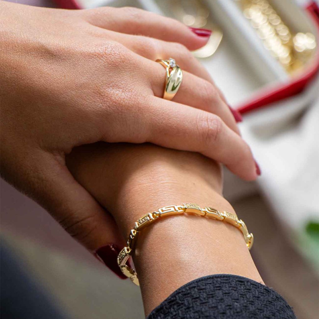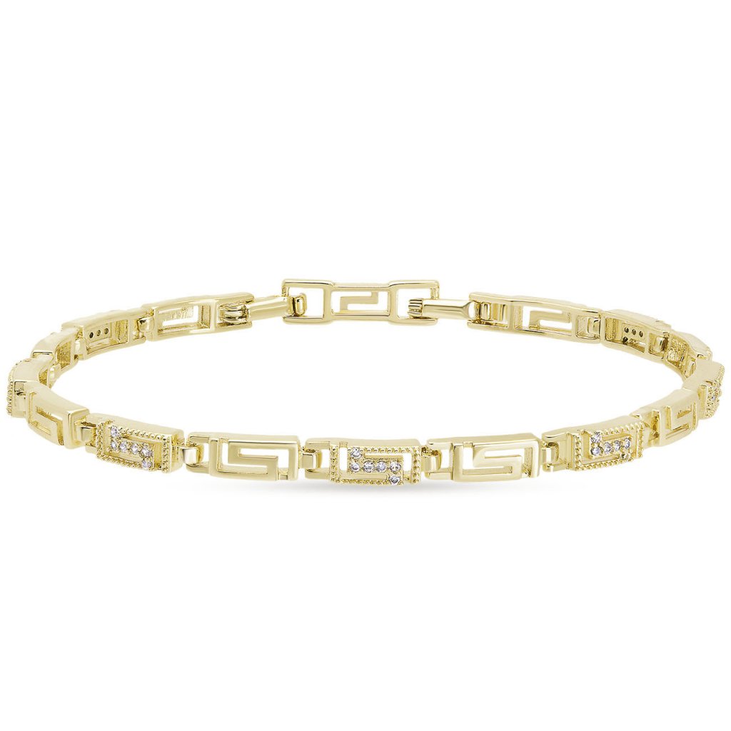 A finoman kidolgozott szemekkel és diszkrét csillogással rendelkező stílusos karkötő a modern design és az elegancia tökéletes kombinációját képviseli. A finom kövekkel kiegészített geometriai vonalak kifejező kiegészítőt alkotnak, amely kiemeli minden viselőjének egyedi stílusát. Remekül kombinálható más ékszerekkel, és alkalmas mindennapi viseletre és különleges alkalmakra is.
