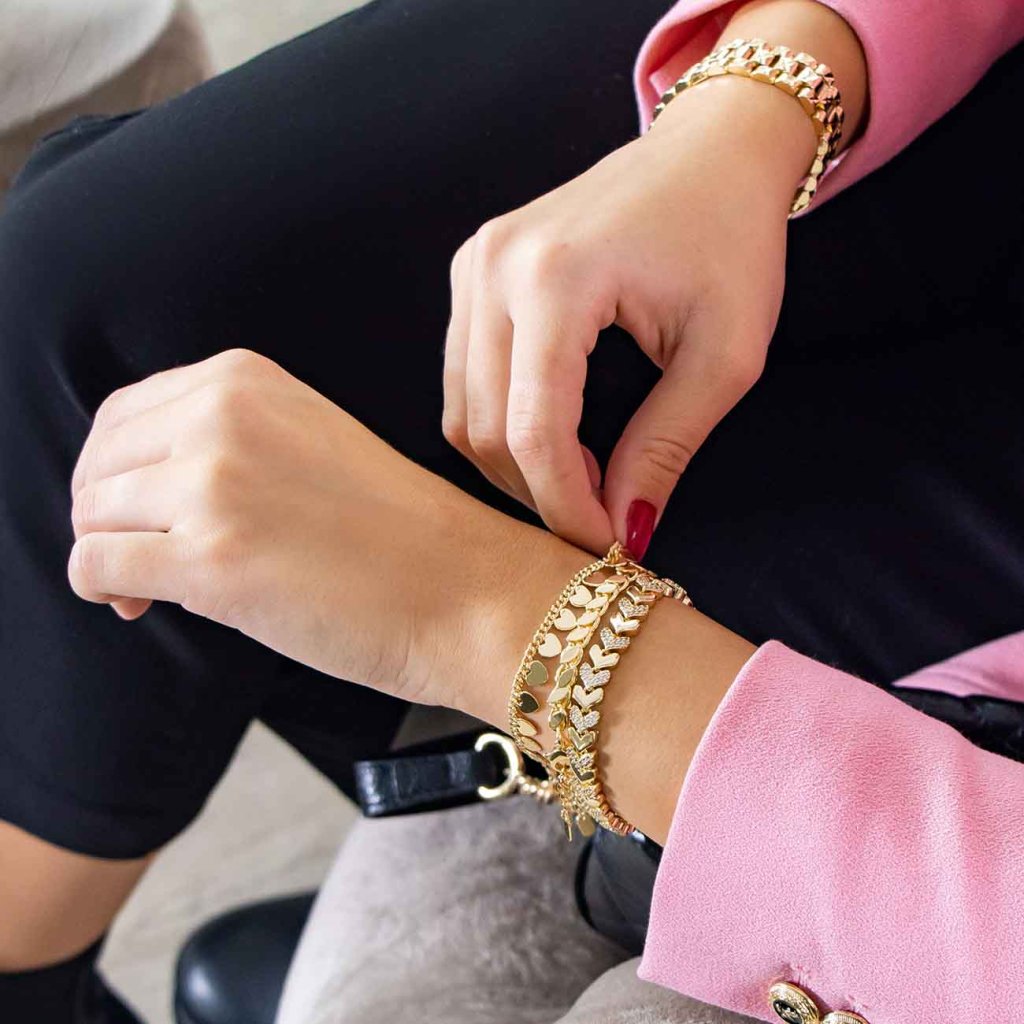 Stílusos karkötő, mely a csuklón a luxus vékony vonalaként hat. A szívecske alakú szemek mindegyike részben apró, tiszta cirkóniákkal van kirakva, melyek gyönyörű fényt hoznak létre minden mozdulatnál. Elegáns ékszer, mely tökéletesen kiemeli a kifinomult öltözéket.
