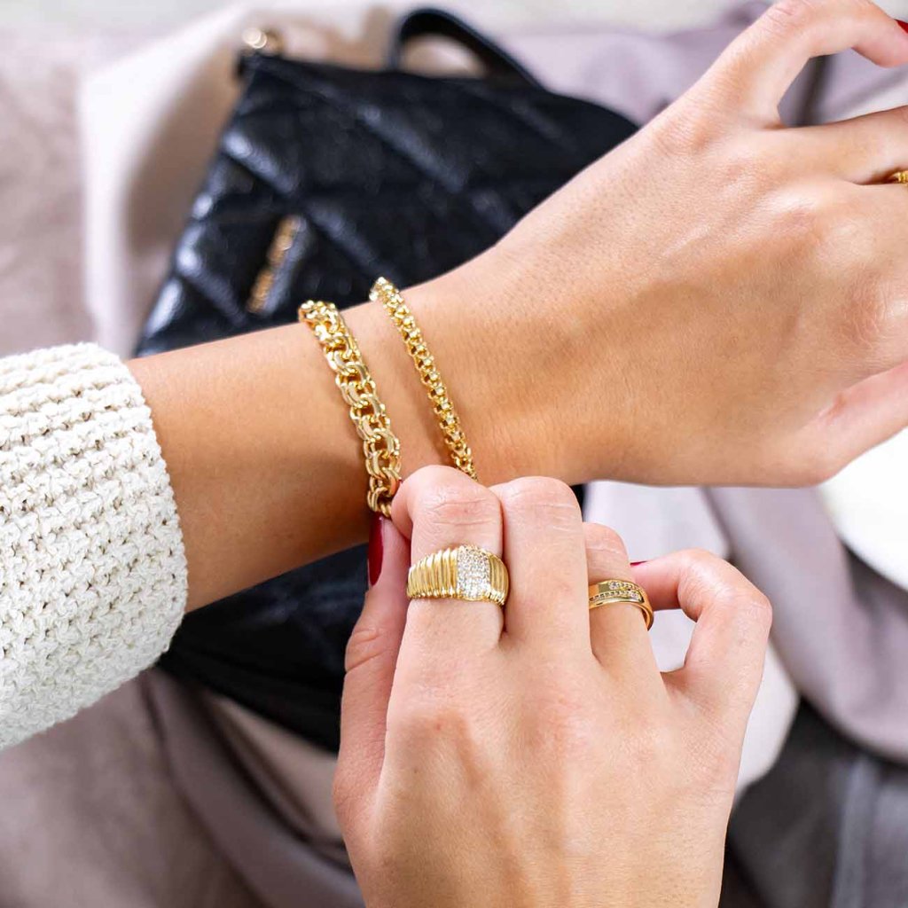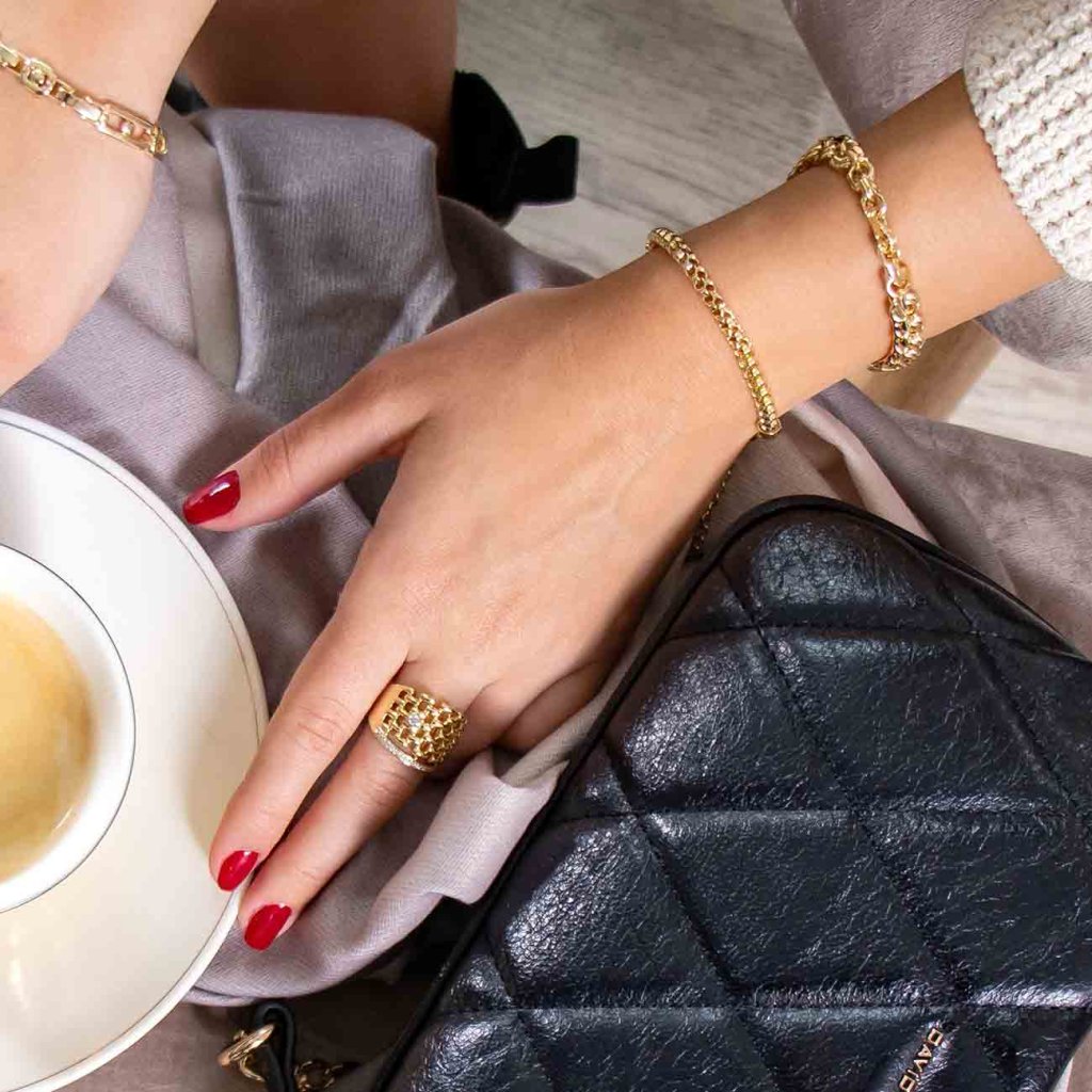 Ez a sűrű szemes lánccal ellátott karkötő fényével és robusztus kivitelével nyűgöz le. Elegáns és kifejező egyszerre, tökéletesen kiegészíti a mindennapi öltözéket és az ünnepi alkalmakat is. A minőségi kidolgozásnak köszönhetően luxus hatást kelt anélkül, hogy a kényelem rovására menne viselés közben.
