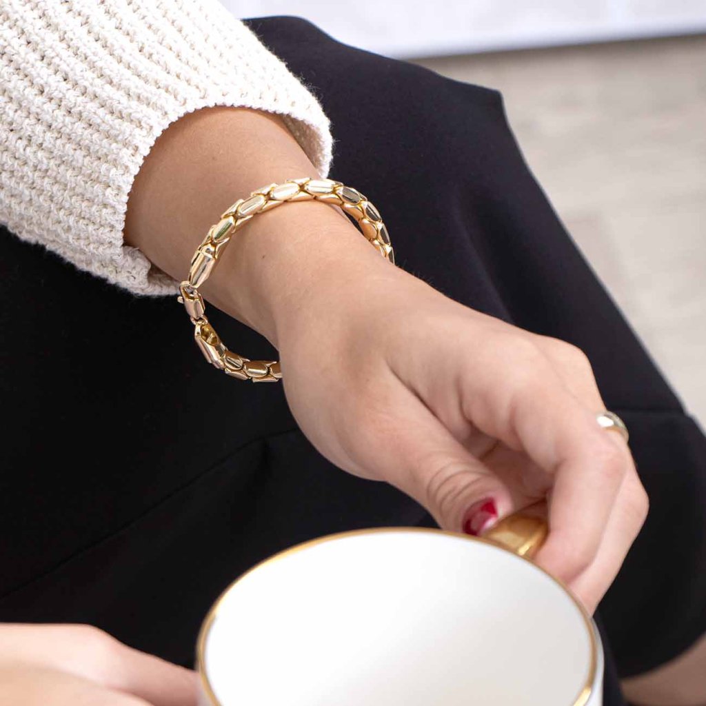 Ez az elegáns, sima, ovális szemes karkötő időtlen sziluettjével és magas fényével nyűgöz le. Finom kidolgozásának köszönhetően alkalmas mindennapi viseletre és ünnepi alkalmakra is. Remekül kombinálható más ékszerekkel vagy órákkal, és egy csipetnyi eleganciát és önbizalmat kölcsönöz a teljes megjelenésnek.