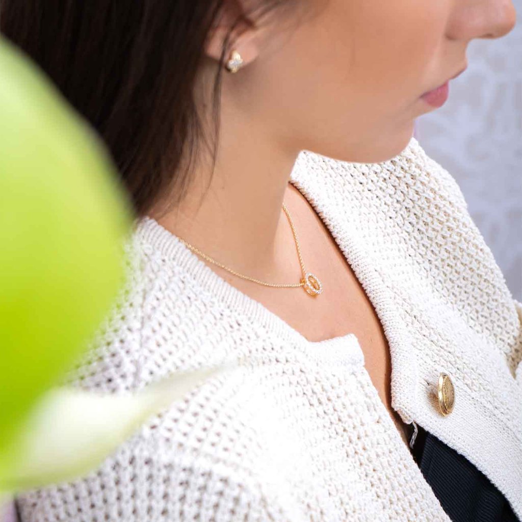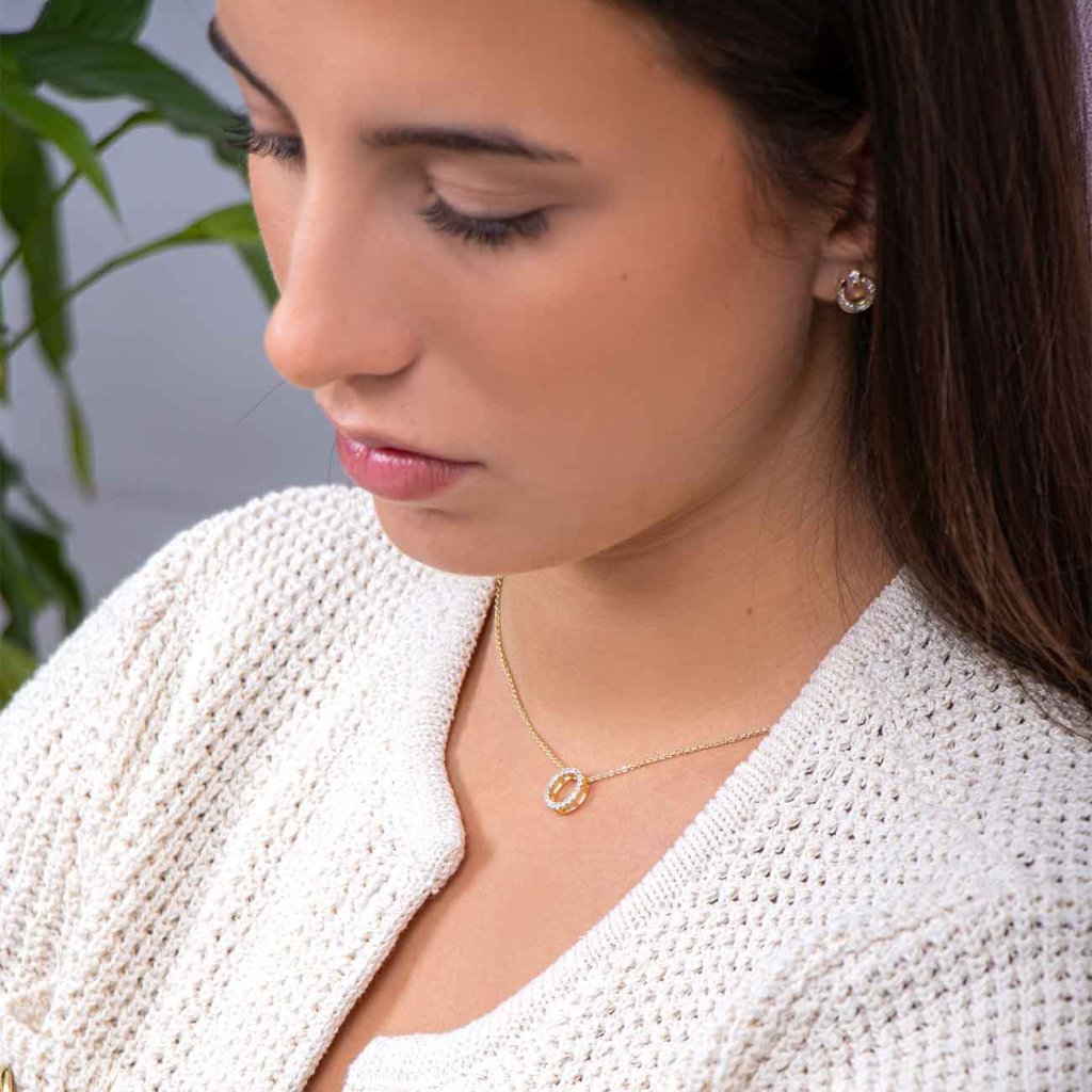 Az egyszerű, mégis feltűnő, tiszta cirkónia kövekkel kirakott kör alakú medállal ellátott nyaklánc időtlen eleganciát és finom fényt kölcsönöz. Ideális mindennapi viseletre és ünnepi alkalmakra – tökéletesen kiegészít minden öltözéket. A harmonikus kör az egységet, a teljességet és a végtelenséget szimbolizálja, így gyönyörű ajándék mélyebb jelentéssel.