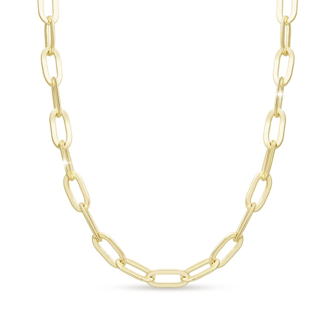 A nagyobb, ovális szemekkel ellátott, feltűnő lánc elegáns ékszer, divatos hatással. Ideális rétegezéshez vagy önálló, hangsúlyos kiegészítőként. A precíz kivitelezésnek és a fényes felületnek köszönhetően luxus és időtálló hatást kelt. A 14 karátos aranyozás meleg arany árnyalatot biztosít és kiemeli elegáns vonalait.