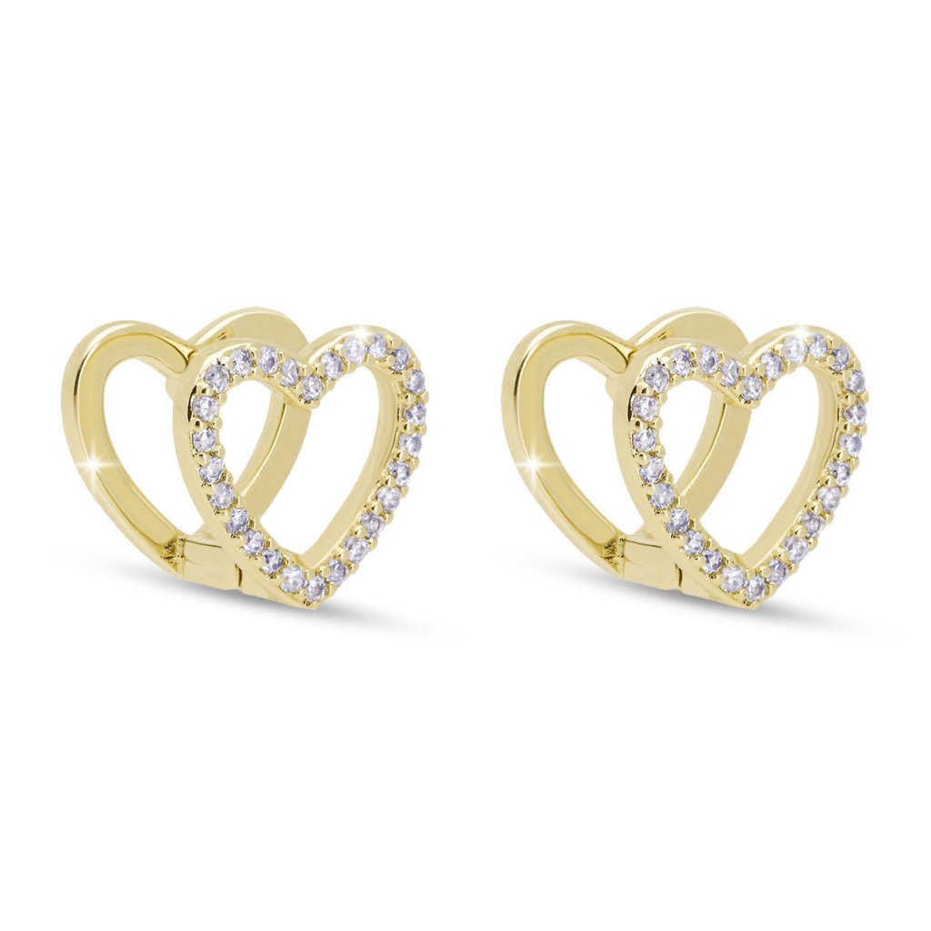 Időtlen szerelmi szimbólum elegáns kivitelben. Ezek a szív alakú, aranyozott fülbevalók tiszta cirkóniával vannak kirakva, amely finom csillogást kölcsönöz nekik. A modern design, két szívvonallal, eredeti és mégis gyengéd hatást kelt – tökéletes választás mindennapi viseletre és különleges alkalmakra.