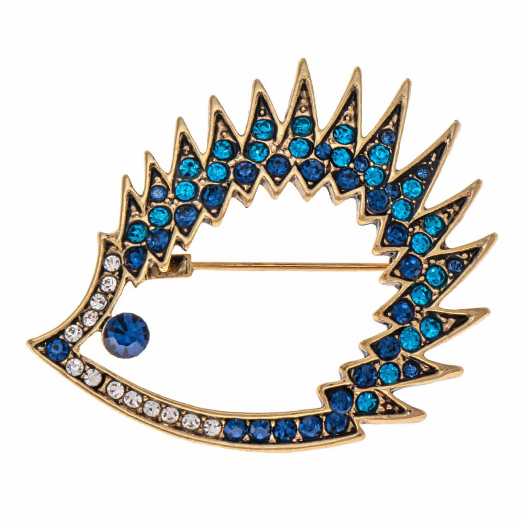 Az eredeti, stilizált sün formájú bross lenyűgöz a sötétkék, türkiz és átlátszó üvegkövek kombinációjával. Az arany alap kontrasztot kölcsönöz az ékszernek, és kiemeli a kövek ragyogó fényét.
