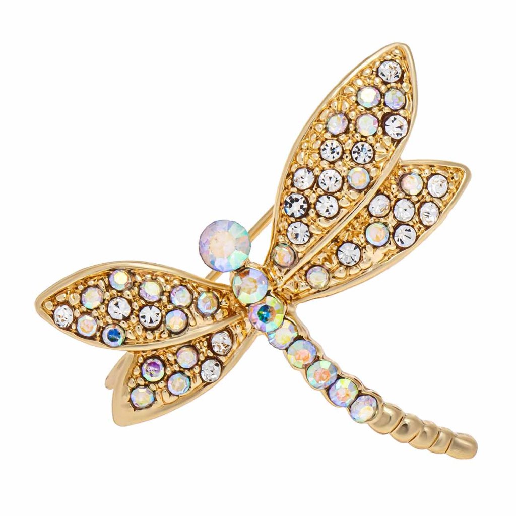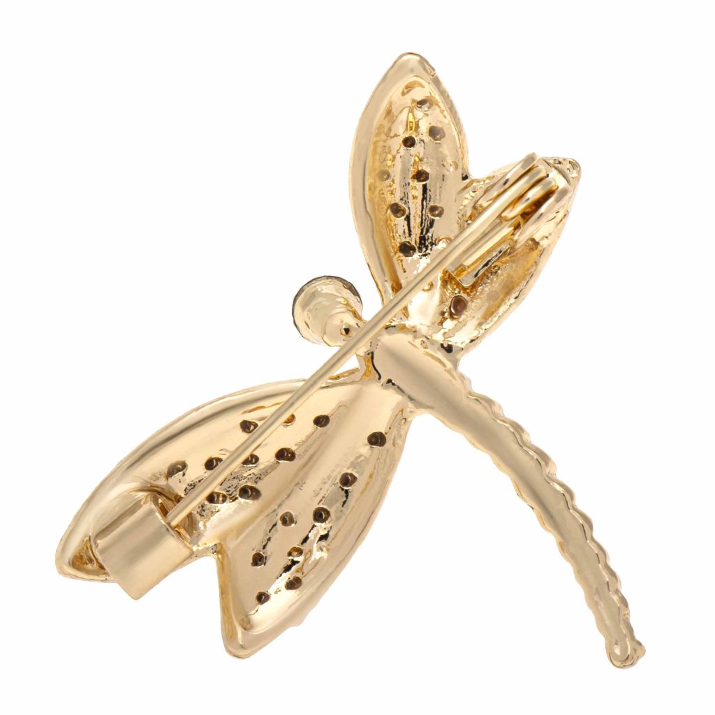 Az elegáns szitakötő alakú bross csillogó, AB hatású cirkóniákkal van díszítve, amelyek a fény beesési szögének függvényében változtatják a színüket. A bross arany alapja meleg és luxus hatást kölcsönöz az egész kompozíciónak. Ideális kiegészítő zakóhoz, sálhoz vagy kabáthoz.