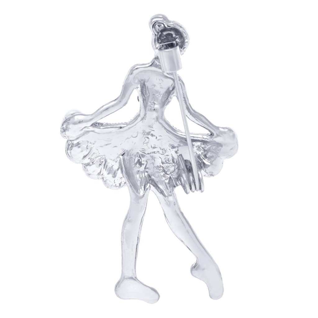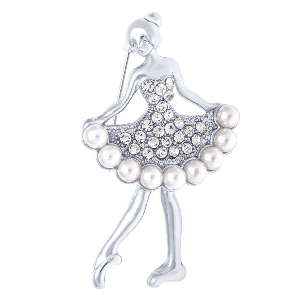 Ezüst tónusú, romantikus balerina bross, melyet csillogó cirkónia kövek és finom gyöngyök díszítenek a szoknyáján. A finom vonalak és a fényes felület elbűvölő kiegészítővé teszik ruhákhoz, zakókhoz vagy sálakhoz. Bizsu fémből készült, bross tűvel rögzíthető.