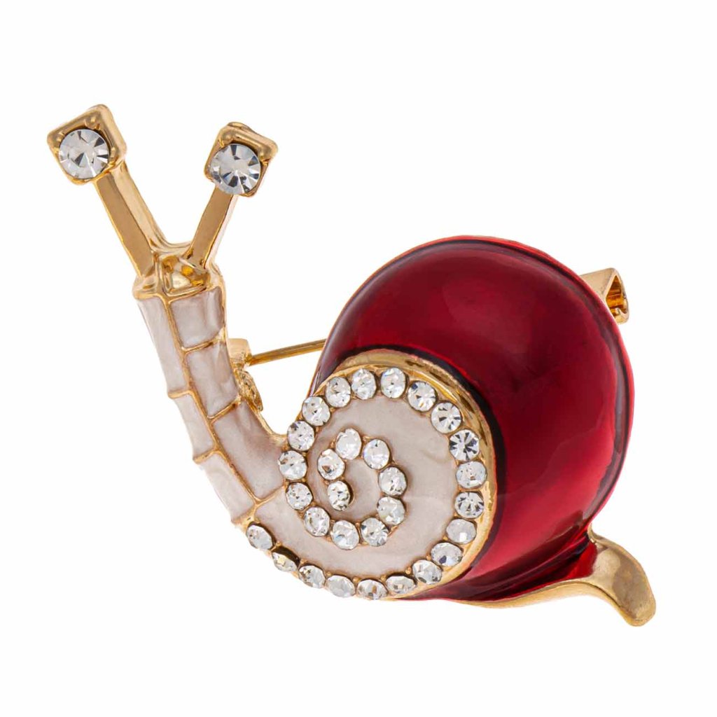 Eredeti csiga alakú bross feltűnő bordó házzal és csillogó, áttetsző kövekkel díszített testtel. Stílusos és játékos kiegészítő, amely feldobja a kabátot, sálat vagy táskát.