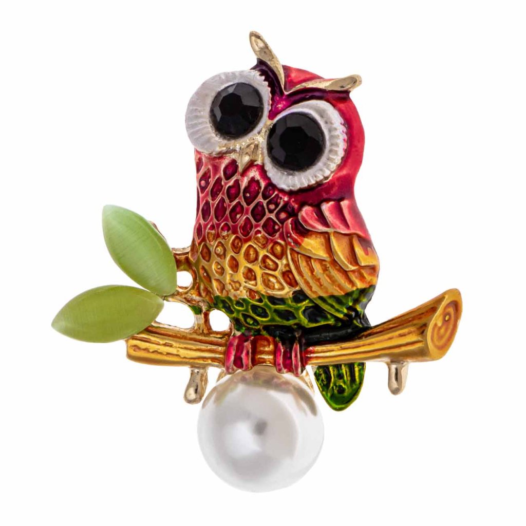 Kifejező bagoly alakú bross gazdagon színes mázzal, fekete szemekkel és dekoratív gyönggyel. Aranyszínű ágon ül finom zöld levelekkel – ideális eredeti kiegészítőként, valamint a bölcsesség és a játékosság szimbólumaként.