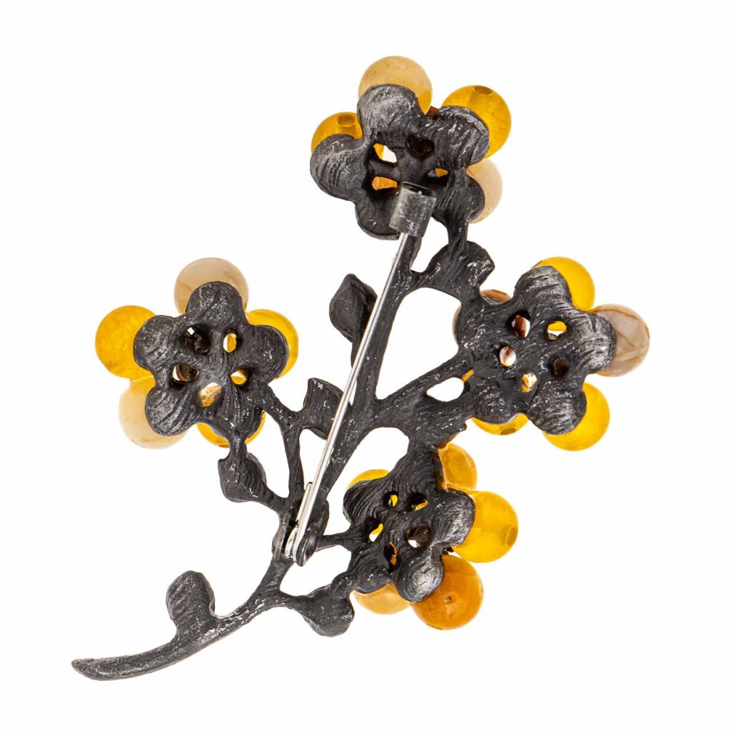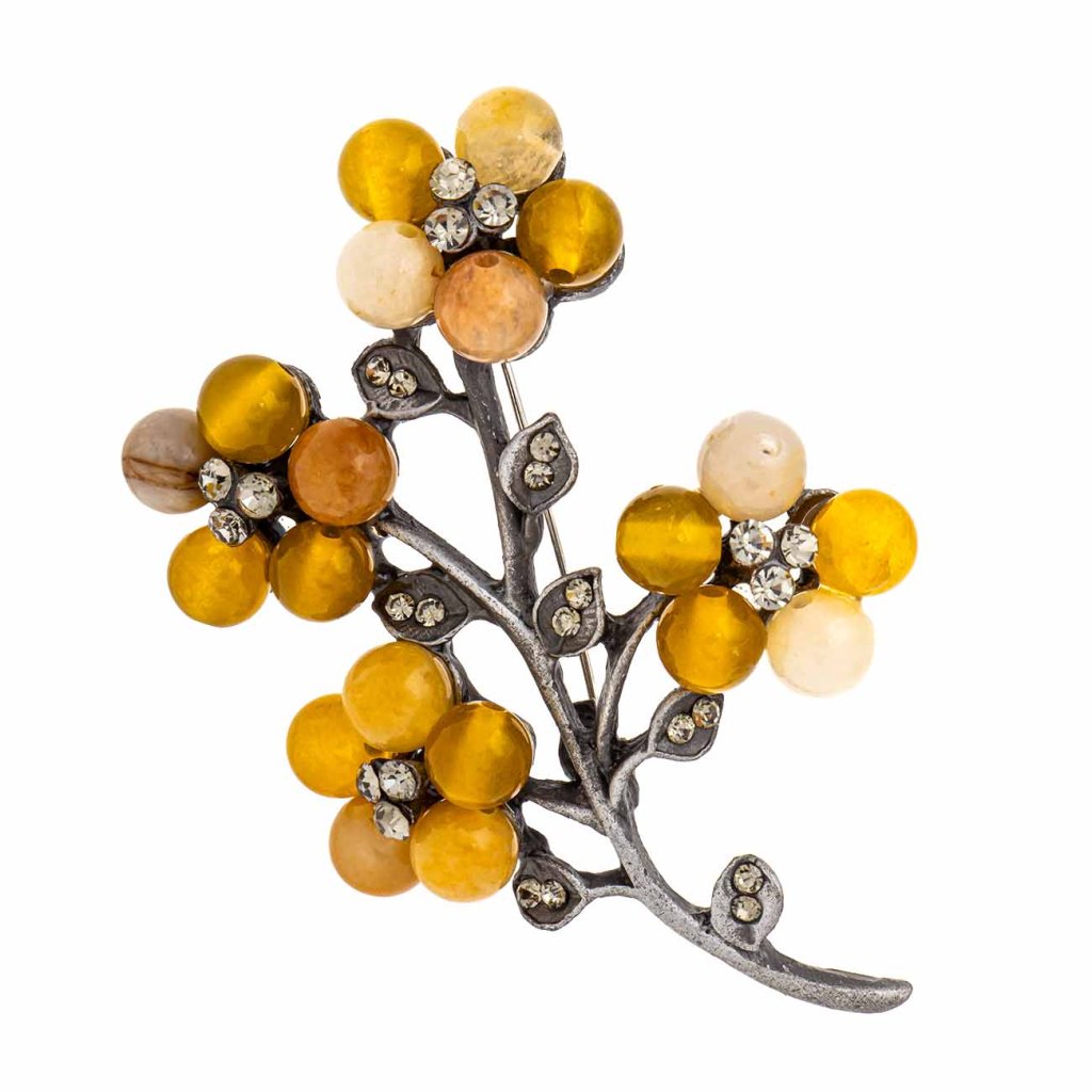 Ez a gyönyörű, ág alakú bross, melynek virágai a sárga és bézs meleg árnyalataiban pompáznak, finom, természetes hangsúlyt kölcsönöz az öltözéknek. A virágokat fényes gyöngyök alkotják, melyeket csillogó cirkónia kövek egészítenek ki a középső részben. Az antracit színű fém alap apró levelekkel kiemeli ennek a kiegészítőnek az egyedi megjelenését.