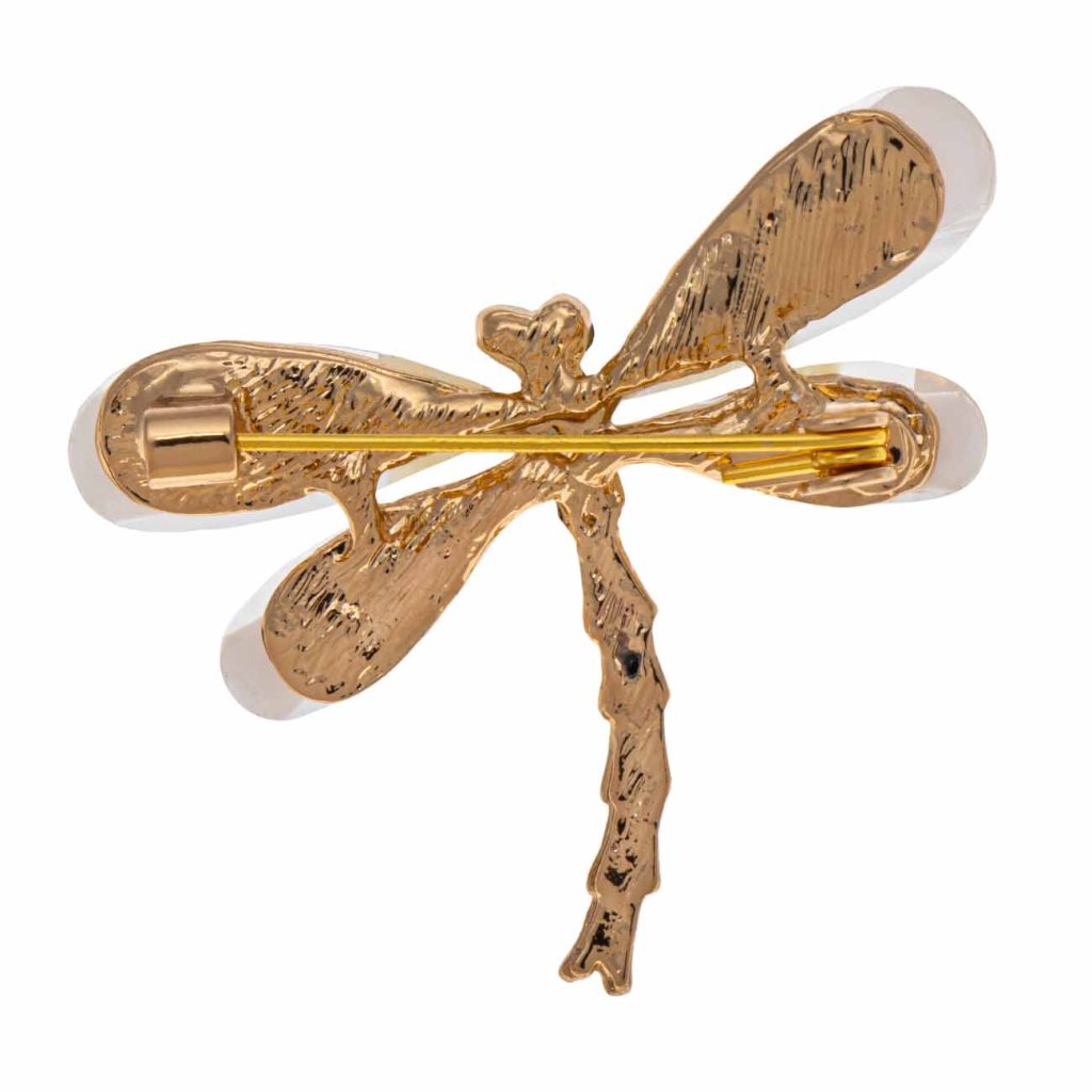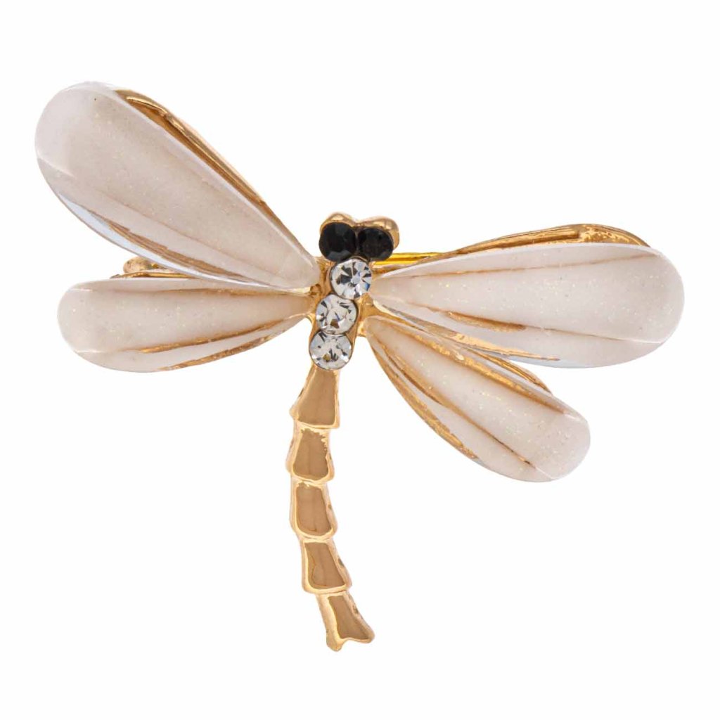 Elegáns szitakötő bross arany testtel, gyöngyházfehér szárnyakkal és három tiszta kővel a testén. Finom és visszafogott kiegészítő, amely minden öltözéknek egy csipetnyi könnyedséget és bájt kölcsönöz.
