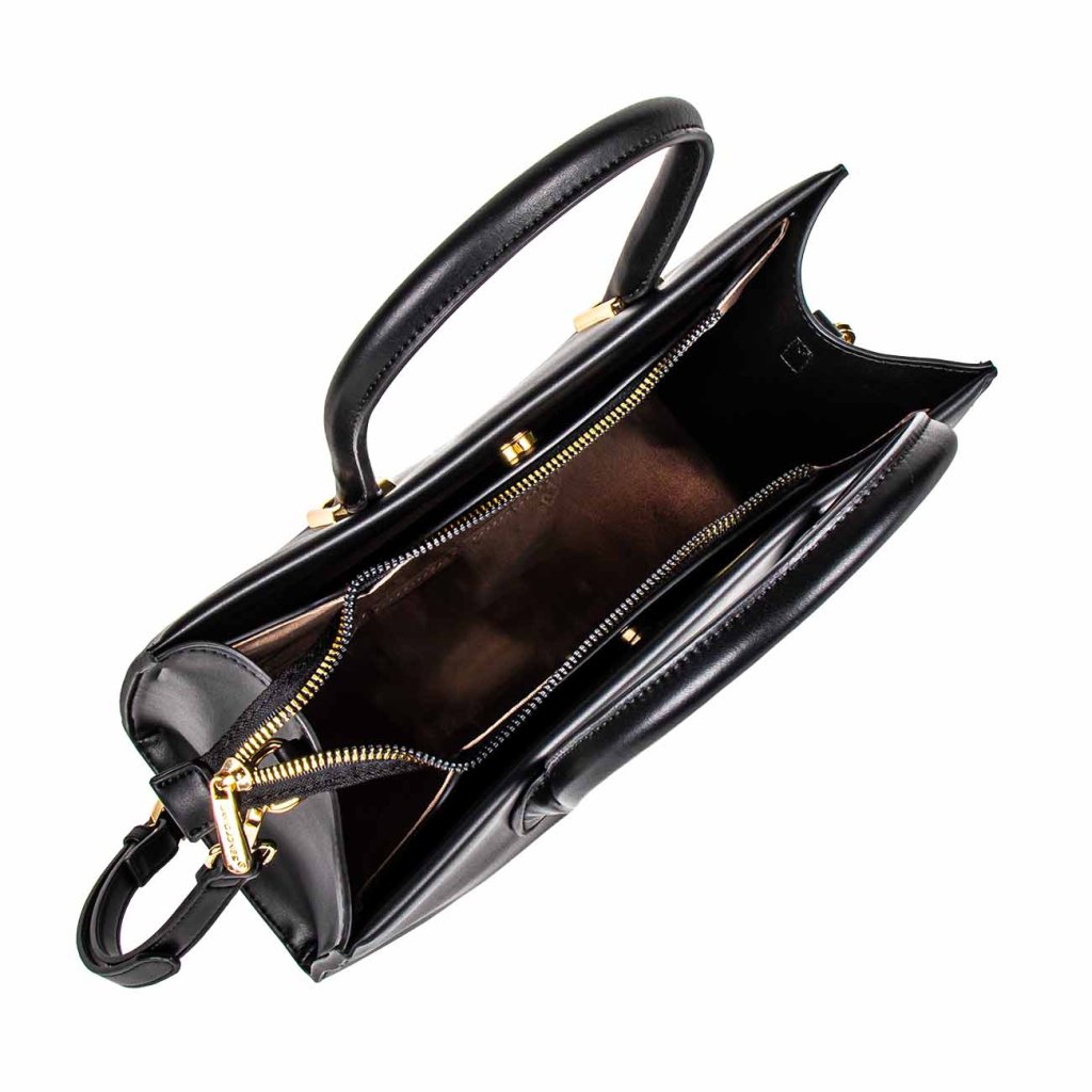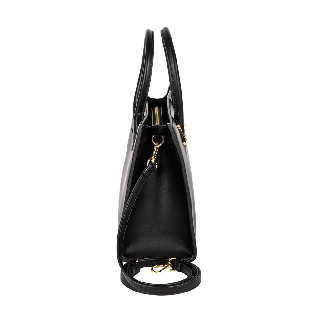 A kézitáska kényelmesen hordható kézben a fix fogantyúkkal, vagy vállon az állítható és levehető pánttal.