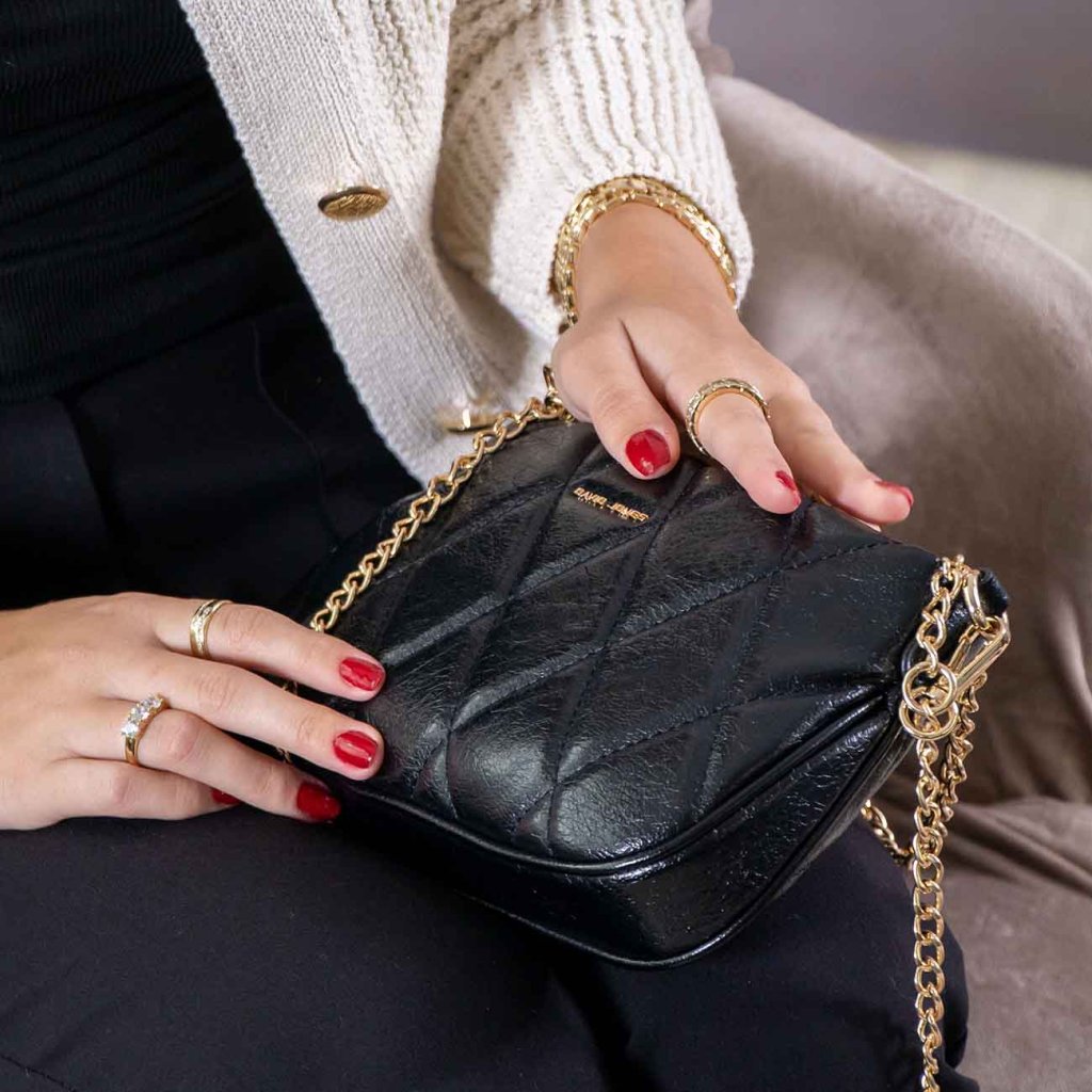 - A táska hosszú, aranyszínű lánccal ellátott pánttal rendelkezik, amely karabinerekkel levehető.