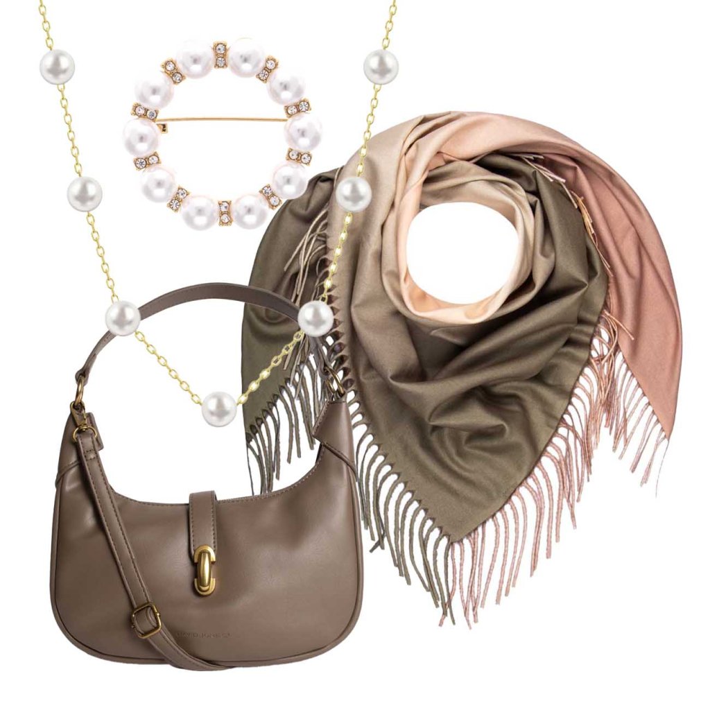 Ez a finoman összehangolt divatszett a melegséget, eleganciát és modern stílust ötvözi. Az univerzális taupe színű, kézbe simuló kézitáska rendkívül sokoldalúnak tűnik, és az arany részleteknek köszönhetően remekül kiegészíti mind a hétköznapi, mind a társasági öltözéket. A kellemes bézs-szürke árnyalatokban pompázó, puha rojtokkal díszített sál felmelegít és luxus, réteges hatást kelt.