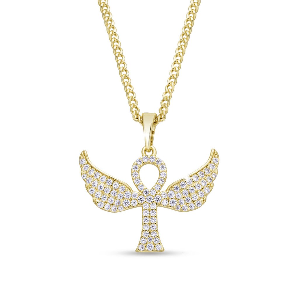 Ez az angyal alakú medállal díszített, ragyogó nyaklánc nem csupán stílusos kiegészítő, hanem a védelem, a hit és a remény erős szimbóluma is. A medált gazdagon borítják apró, tiszta cirkónia kövek, amelyek gyönyörűen tükrözik a fényt, és csillogó hatást kölcsönöznek az ékszernek. A finom, lapos szemekből álló lánc tökéletesen kiegészíti az összképet.