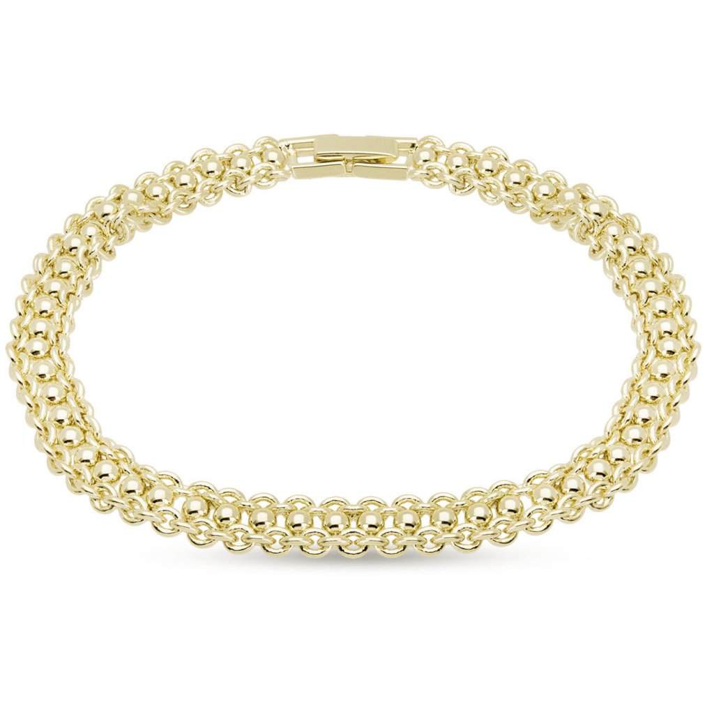 Az elegáns, finom, kerek szemek sűrű szerkezetéből álló karkötő gazdag textúrájával és precíz kidolgozásával nyűgöz le. A 14 karátos arany bevonat kifinomult megjelenést és csillogó hatást kölcsönöz az ékszernek. Ideális kiegészítő azoknak a nőknek, akik szeretik a feltűnő, de ízléses ékszereket.