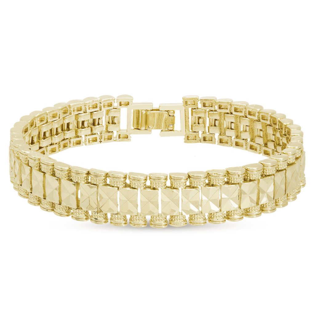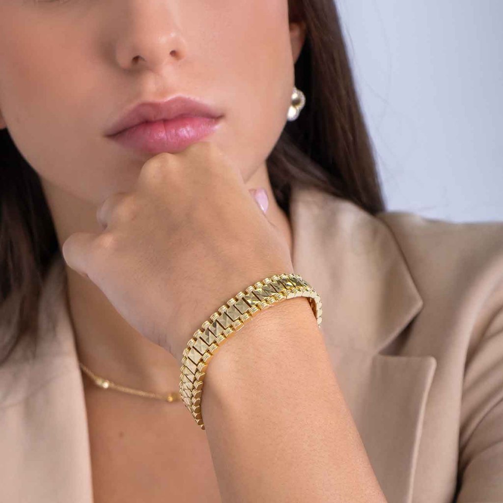 A dizájnos, feltűnő, aranyfényű karkötő kifinomult kidolgozásával és eredeti cikkszerkezetével hívja fel magára a figyelmet. A finom kövekkel kiegészített geometrikus vonalak luxus megjelenést kölcsönöznek, amely kiemeli stílusát és minden öltözéknek különleges részletet ad.