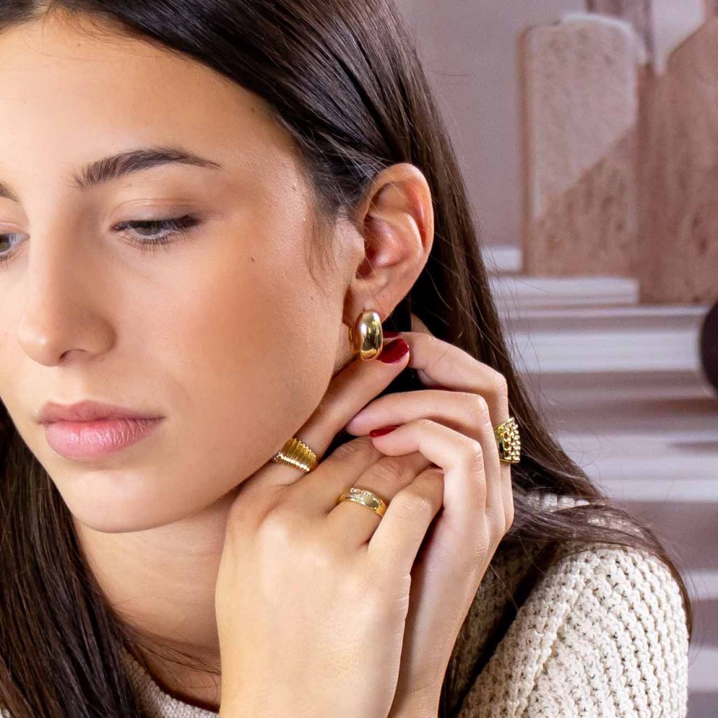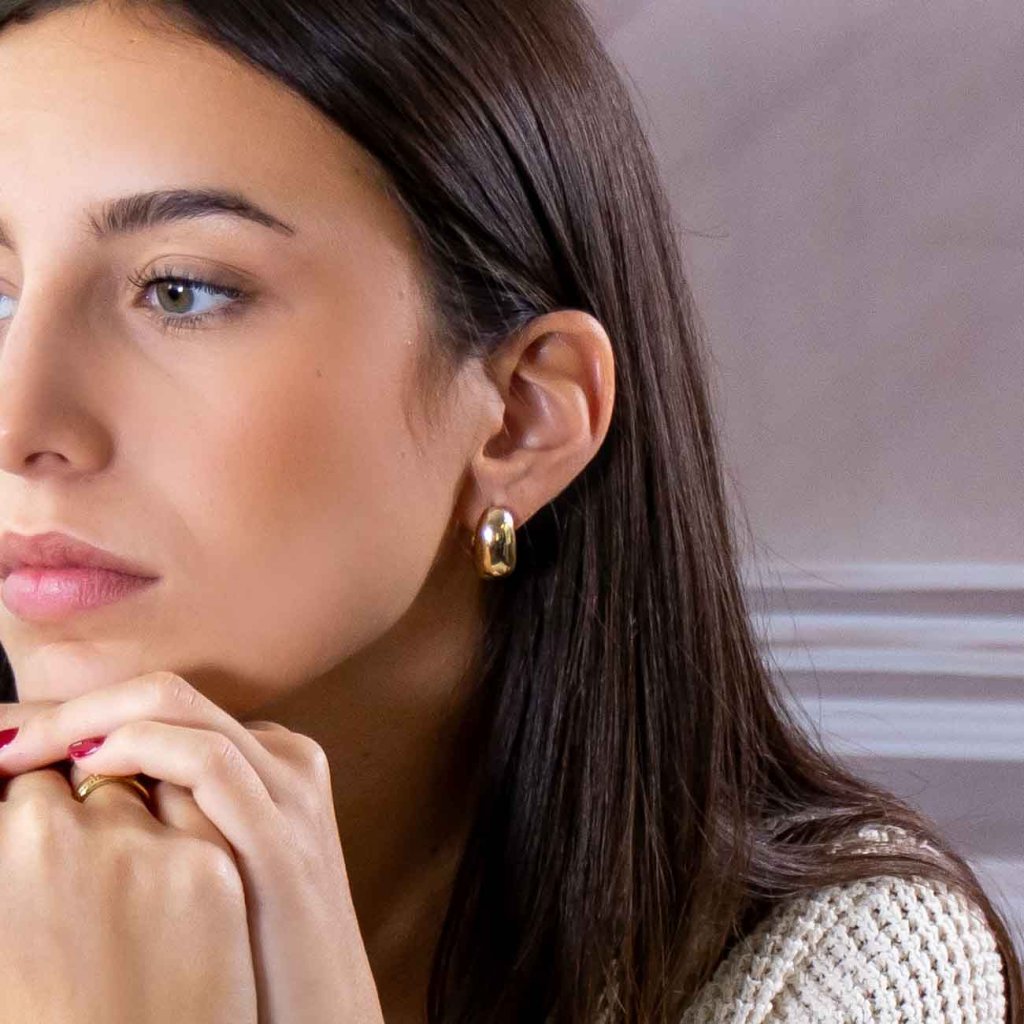 Ezek a masszív hatású, ovális fülbevalók letisztult és fényes dizájnjukkal hívják fel magukra a figyelmet. A sima, tükröződő felület a meleg tónusú, aranyozott fémmel kombinálva luxus megjelenést kölcsönöz az ékszernek, amely minden alkalommal kiemelkedik. A pattintós zárnak köszönhetően könnyen felhelyezhetők és kényelmesen viselhetők egész nap.