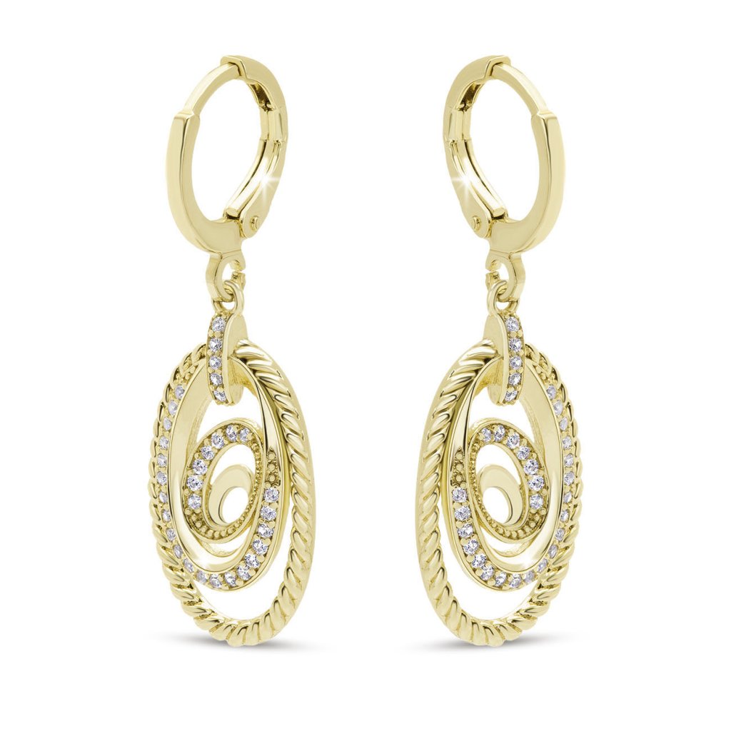Elegáns ékszerszett, amely egy nyakláncból és lógó fülbevalóból áll, melyek eredeti, ovális motívumukkal hívják fel magukra a figyelmet, három rétegben. A sima és finoman díszített szélek, valamint a tiszta cirkónia vonalának kombinációja kifinomult és kifejező hatást kelt. Az ékszerek formája spirálra vagy végtelen mozgásra emlékeztet – ideális választás azoknak a nőknek, akik szeretik a stílusos és egyben időtálló kiegészítőket.