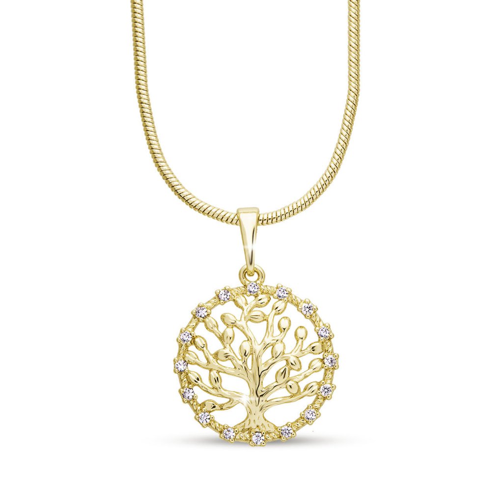 Elegáns nyaklánc az életfa szimbólumával, amely az erőt, az egyensúlyt és a természettel való kapcsolatot képviseli. A kör alakú medál részletesen kidolgozott és csillogó, tiszta cirkóniákkal van kirakva, amelyek szikrát és kifinomult megjelenést kölcsönöznek az ékszernek. A ródiumozott fém és a 14 karátos aranyozás kombinációja biztosítja a magas fényt és a tartós színt.