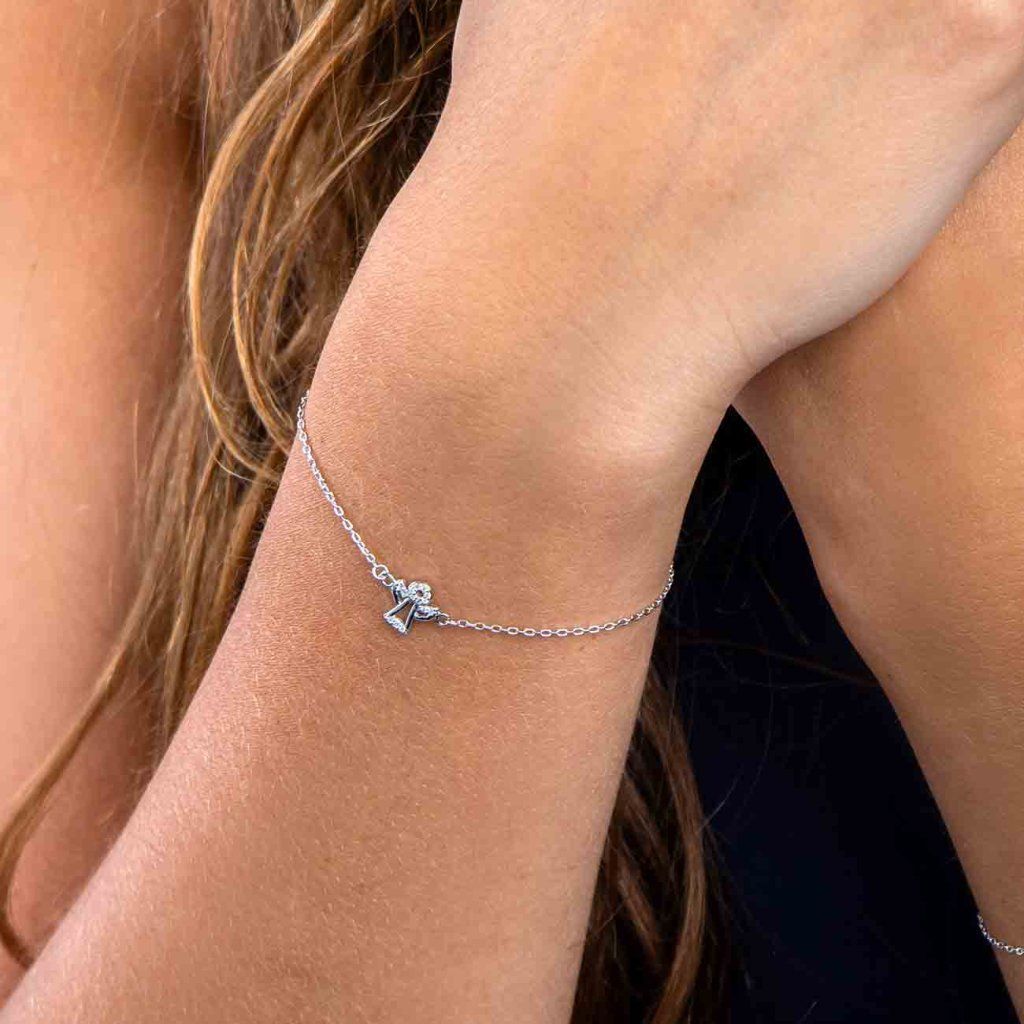 A védelem, a hit és a fény szimbóluma – ezt a finom ezüst karkötőt egy apró angyalka díszíti, amelyet tiszta cirkónia kövekkel raktak ki, amelyek finom csillogást kölcsönöznek neki. Az angyal egy népszerű motívum, amely talizmánként szolgálhat szerencséhez és szerettei védelméhez.