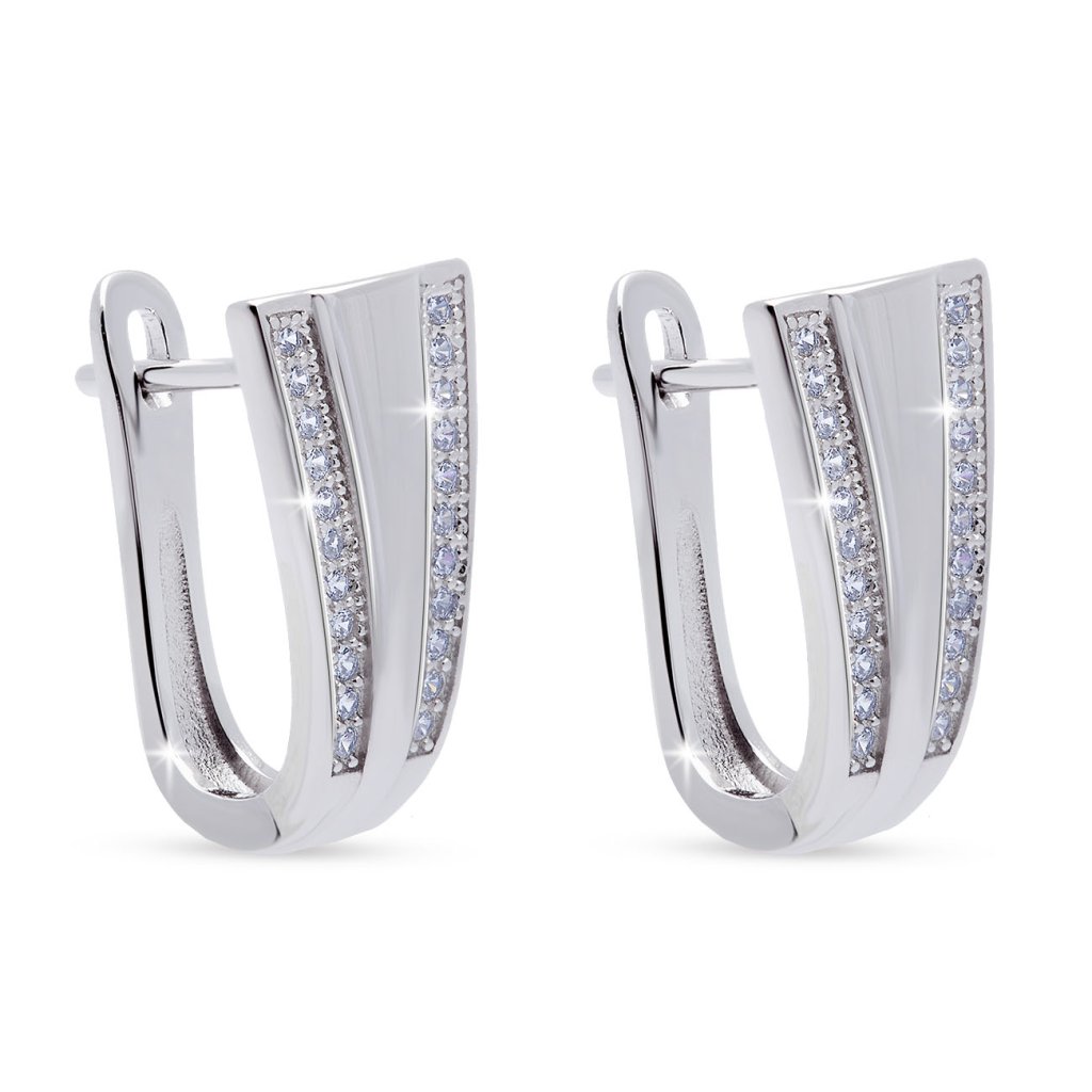 Ezek a hangsúlyosabb, Ag 925/1000 ezüst fülbevalók a tiszta vonalakat ötvözik a két sorban elhelyezett, áttetsző cirkónia finom csillogásával. A kissé szélesedő forma modern és egyben nagyon elegáns hatást kelt. Ideális választás azoknak a nőknek, akik visszafogott, mégis figyelemfelkeltő ékszert keresnek a mindennapi és ünnepi viselethez.