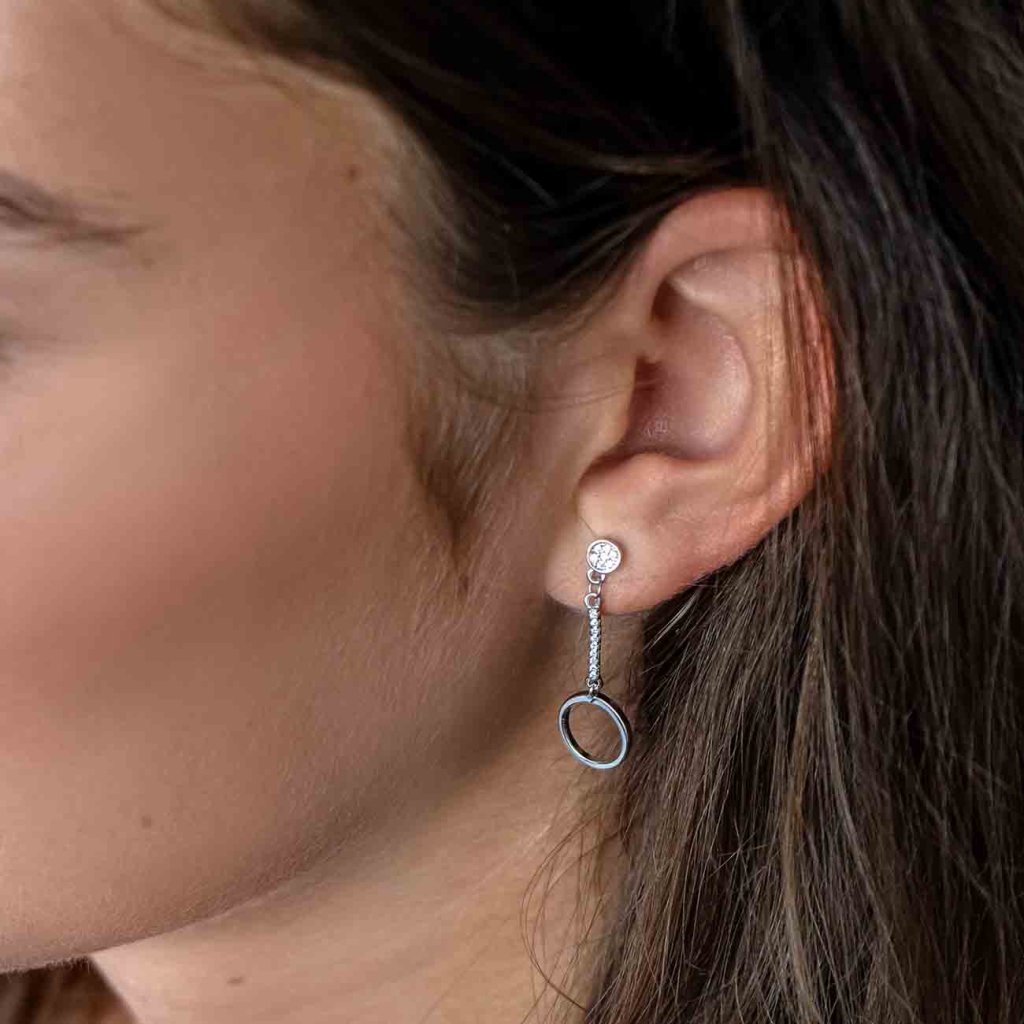Az elegáns, lógó fülbevalók modern dizájnjukkal, fényes karikájukkal és finoman csillogó cirkónia köveikkel hívják fel magukra a figyelmet. A visszafogott fény és a geometrikus forma kombinációja könnyeddé és időtlenné teszi őket. A patentzáras rögzítésnek köszönhetően kényelmes viseletet biztosítanak, és gyönyörűen kiegészítik a hétköznapi és az esti öltözéket egyaránt. Kiváló választás azoknak a nőknek, akik szeretik a stílusos, ugyanakkor finom ékszereket.