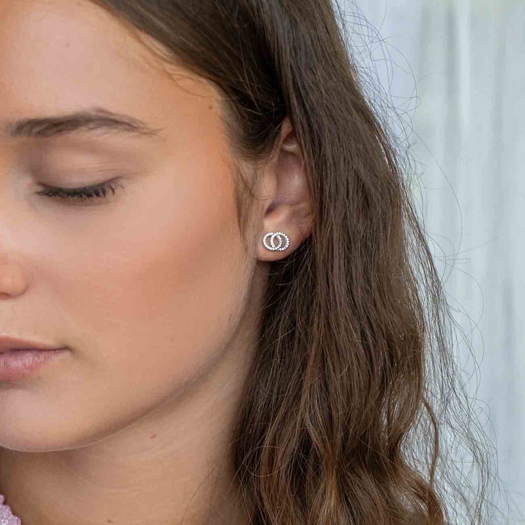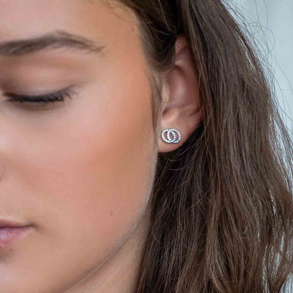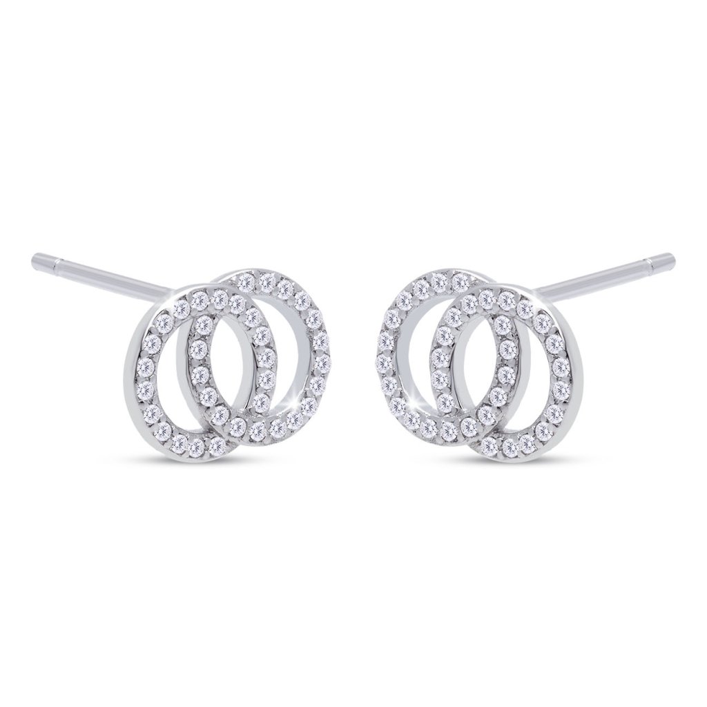 A modern, két egymásba kapcsolódó karikából álló fülbevaló, amelyet csillogó, tiszta cirkóniák díszítenek, eleganciájával és eredetiségével tűnik ki. Ideális mindennapi viseletre és ünnepi alkalmakra is. A stekkeres záródás biztonságos és kényelmes rögzítést biztosít.