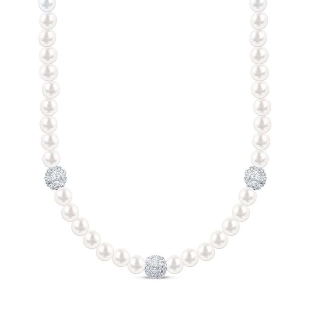 Ez az elegáns nyaklánc valódi Ag 925/1000 ezüstből készült, és a gyöngyök klasszikus szépségét ötvözi a három, áttetsző cirkóniával díszített díszgömb finom csillogásával. Az elemek harmonikus elrendezése egy időtlen ékszert hoz létre, amely ünnepi alkalmakkor és formális öltözékhez is remekül mutat. A precíz kivitelezés és az ezüst részletek finomságot és nemességet kölcsönöznek az ékszernek.