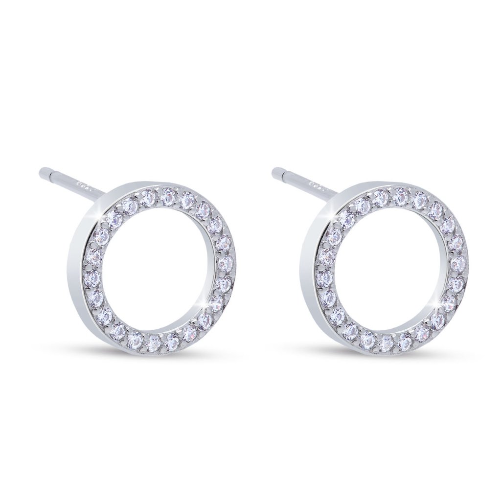Minimalizmus egy csipetnyi ragyogással. Ezek az ezüst fülbevalók modern, kör alakú dizájnnal, finom, tiszta cirkónium kövekkel vannak kirakva a teljes kerületükön, amelyek ragyogást kölcsönöznek anélkül, hogy túlzottan hivalkodóak lennének. A nyitott középrész légies és könnyed megjelenést biztosít. A kényelmes, stekkeres zárásnak köszönhetően ideálisak mindennapi viseletre és elegáns kiegészítőként esti öltözethez is.