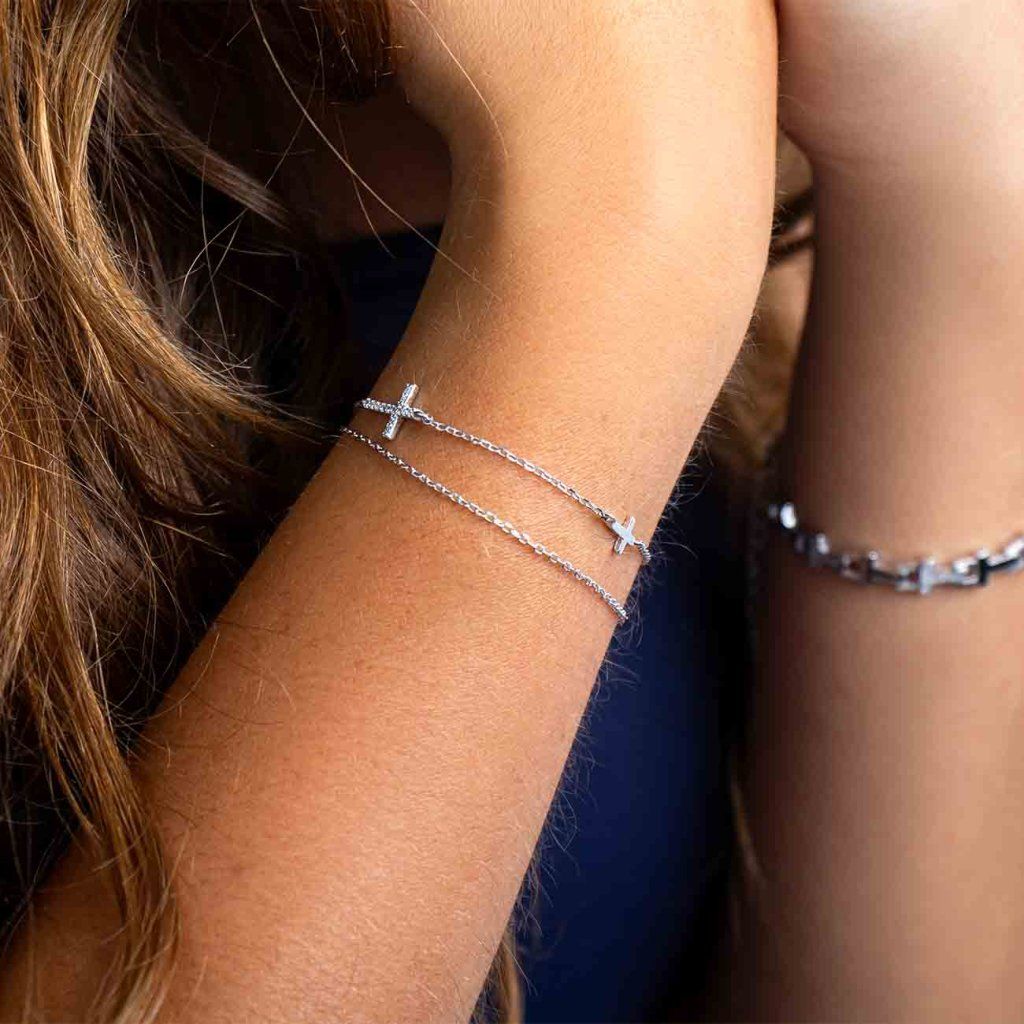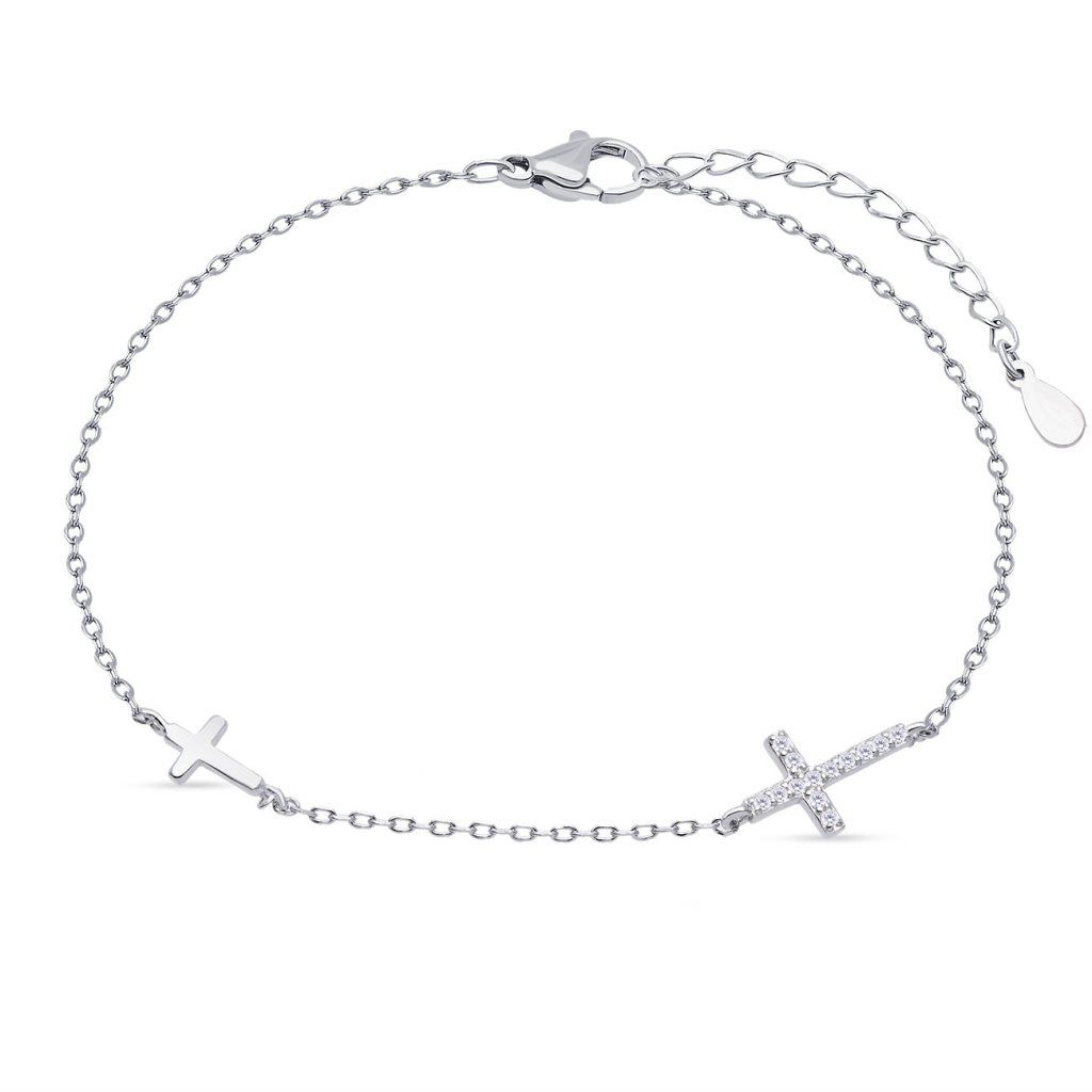 Finom női dupla karkötő, két kereszttel díszítve - cirkónium kövekkel és fényes. Ideális választás ajándékba szerencséhez vagy személyes amulettként.