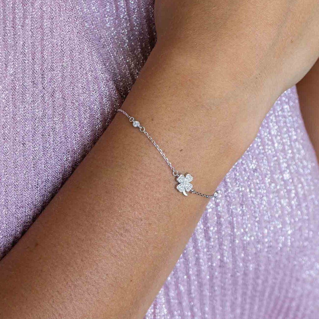 Az elegáns, négylevelű lóhere motívummal díszített ezüst karkötő a finomság és a pozitív energia megtestesítője. A négylevelű lóhere a szerencsét, a reményt, a hitet és a szeretetet hozza – minden levélnek megvan a maga jelentése. A finom cirkónia kövek diszkrét csillogást kölcsönöznek, így az ékszer friss és időtálló hatást kelt. A karkötő ideális ajándék egy szeretett személynek, vagy akár személyes amulettként is viselhető.